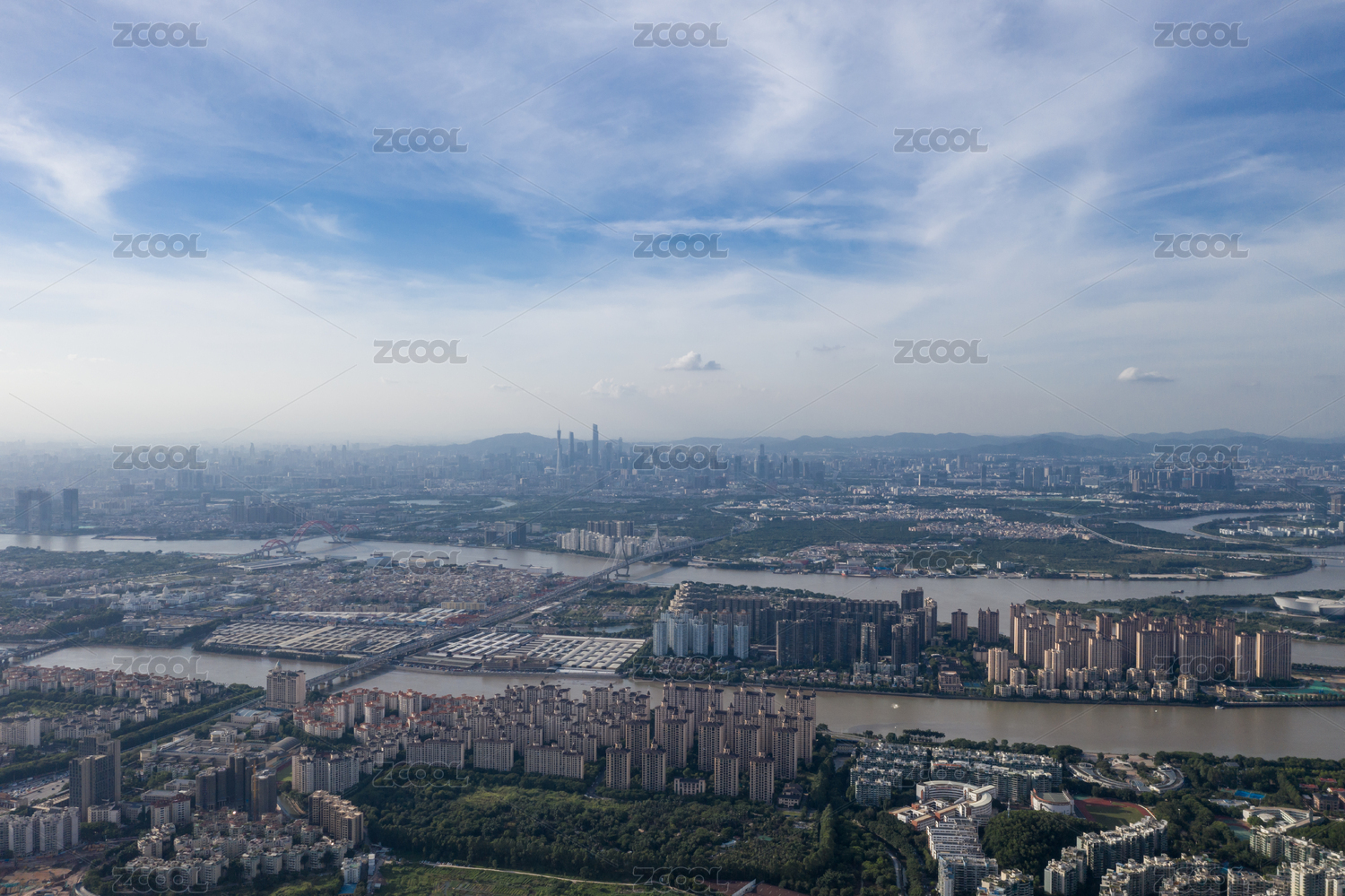 中国广东广州海珠区城市天际线晴天风光航拍全景