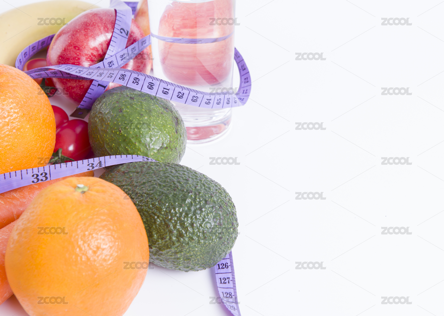 健康饮食,减肥概念,多种水果和蔬菜以及测量带