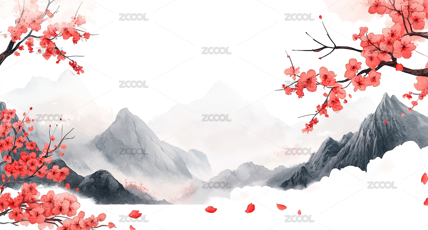 水墨山水远山白色梅花插画