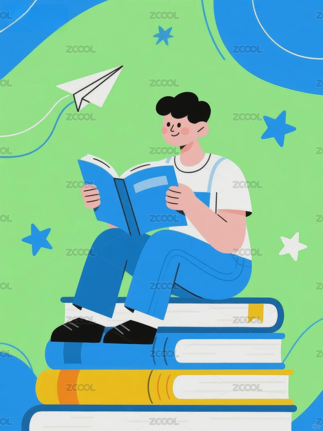 男性坐着靠着一堆书手里拿着书在挑灯阅读