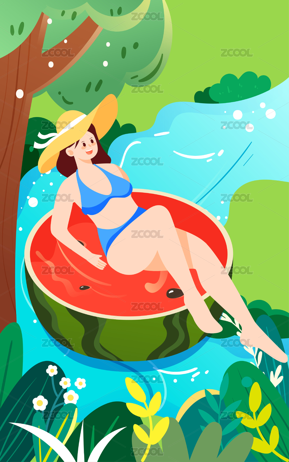 立夏节气人物户外游泳解暑降温夏天旅行插画