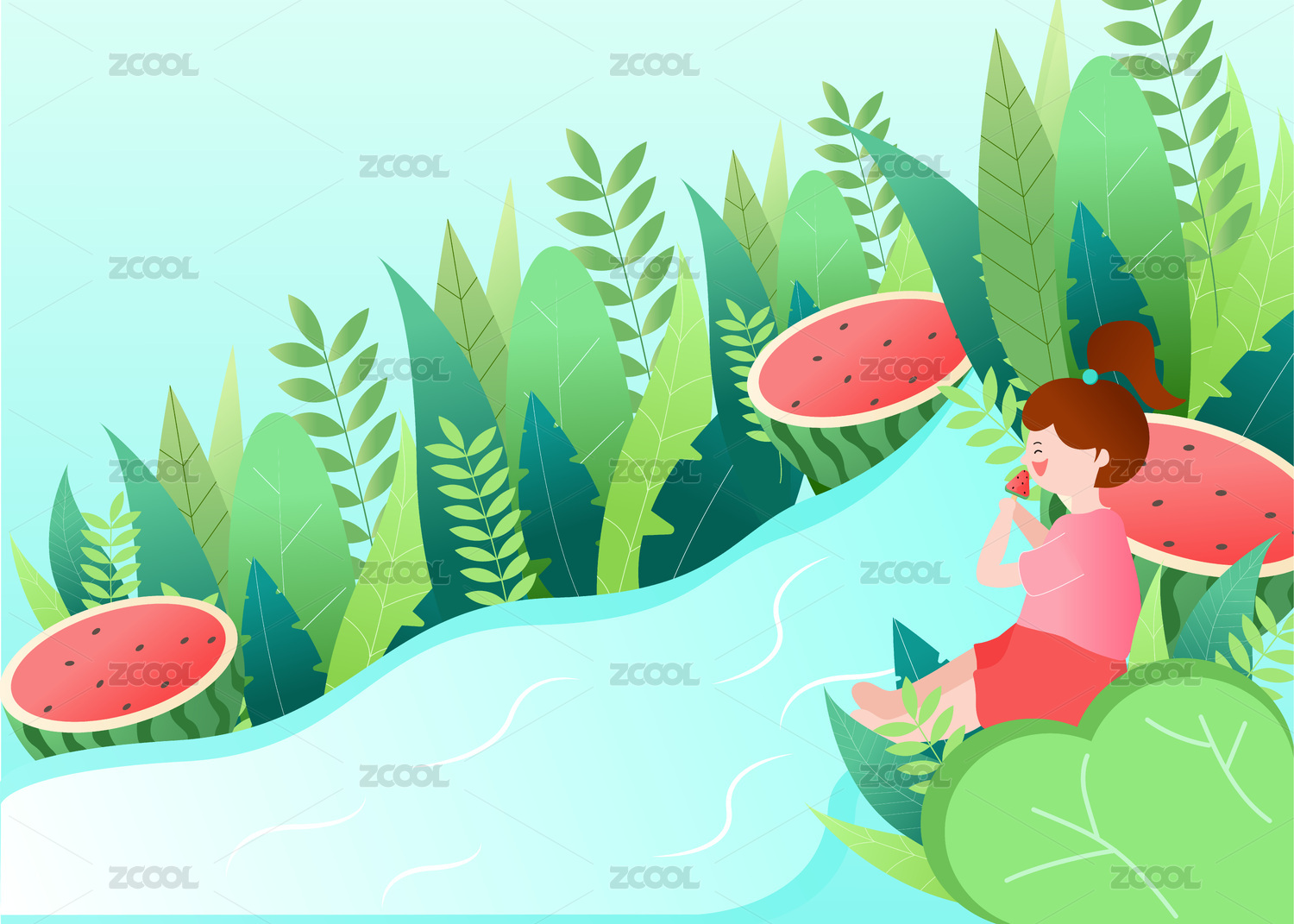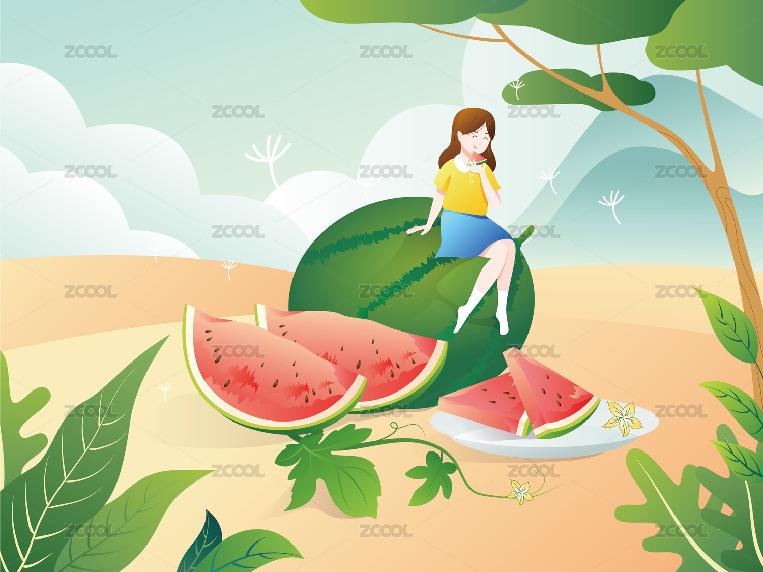 小暑节气人物吃西瓜度假娱乐休闲水果插画