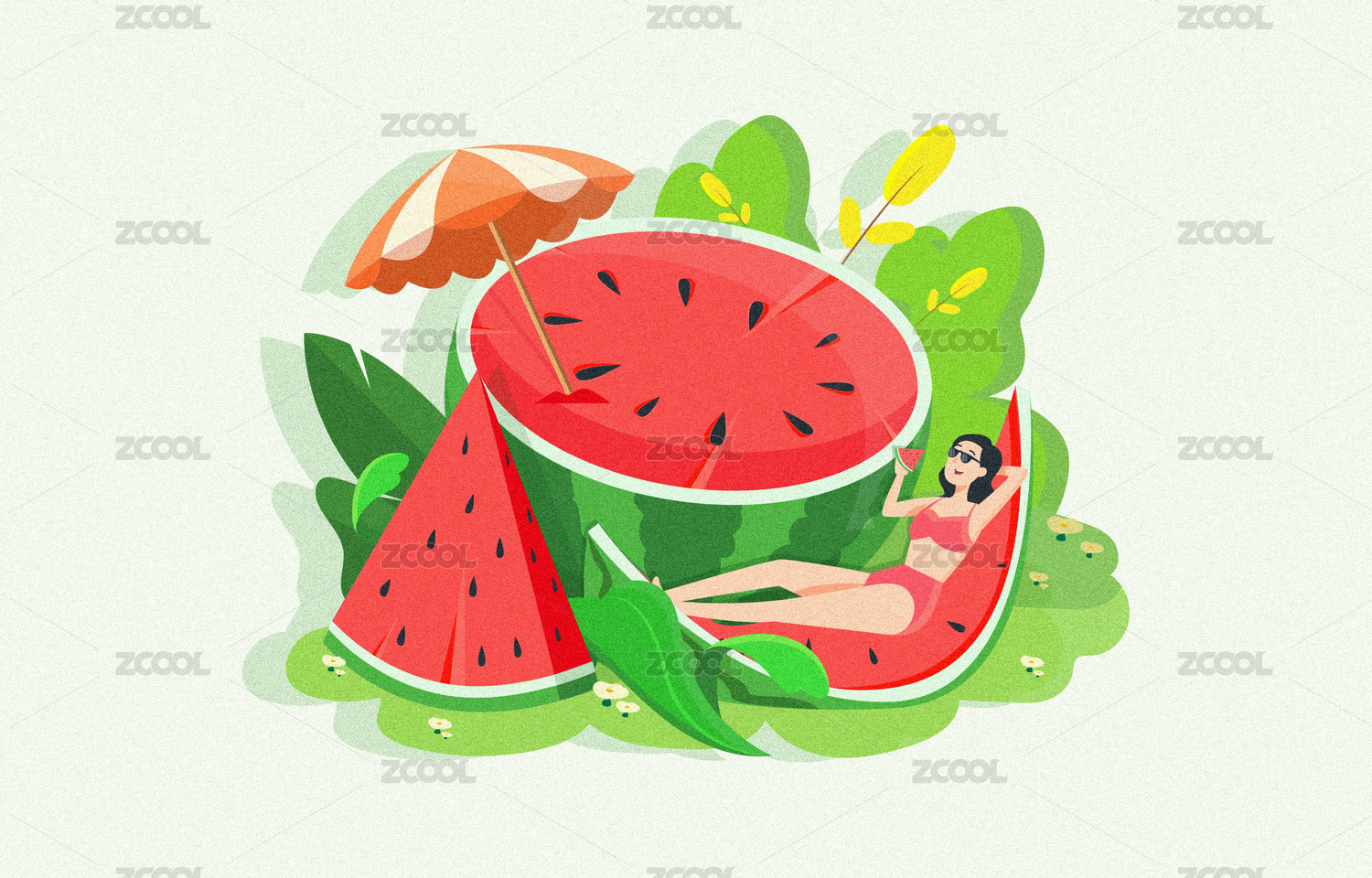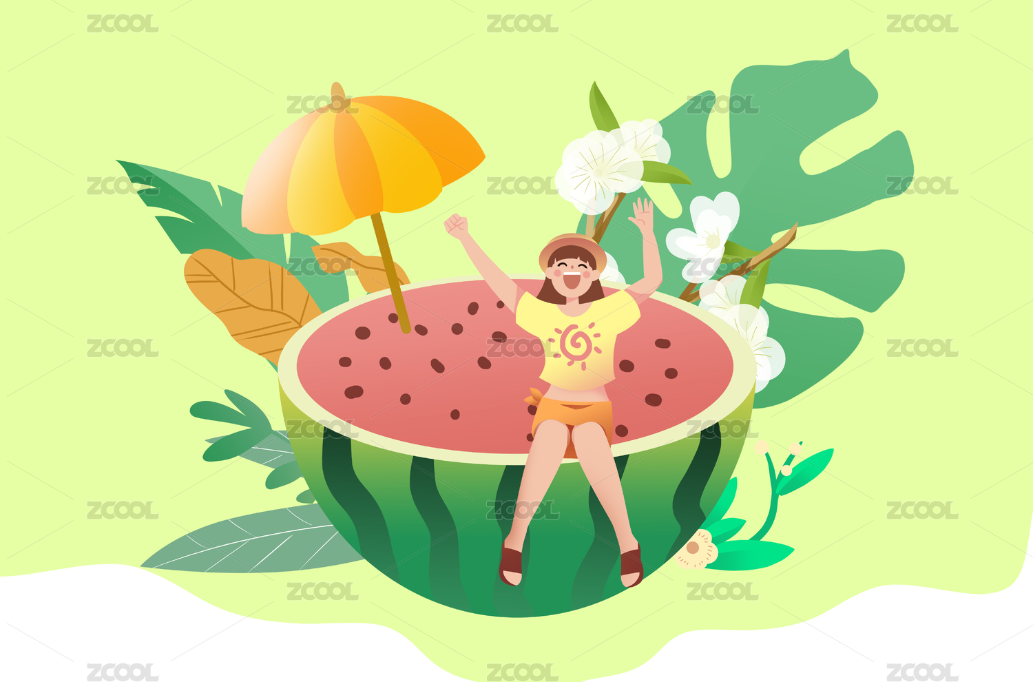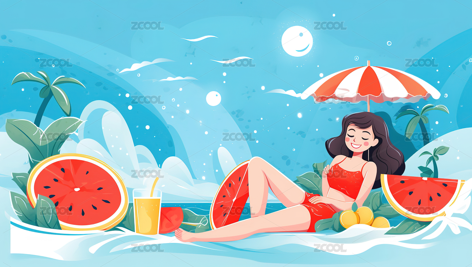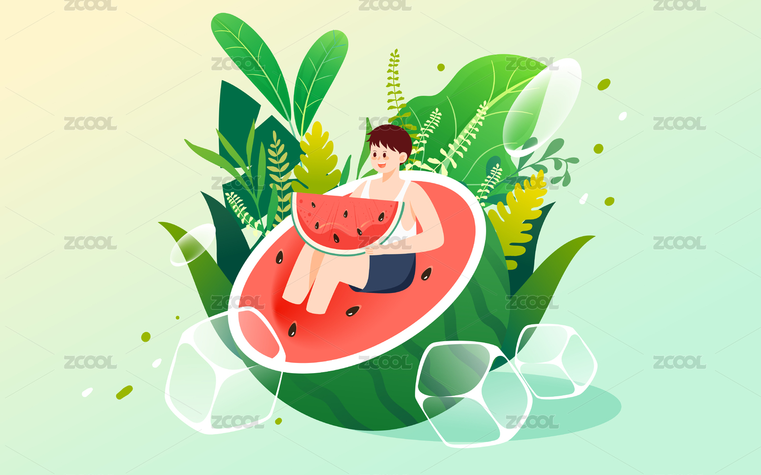 夏天人物清凉解暑插画夏日饮料西瓜美食海报