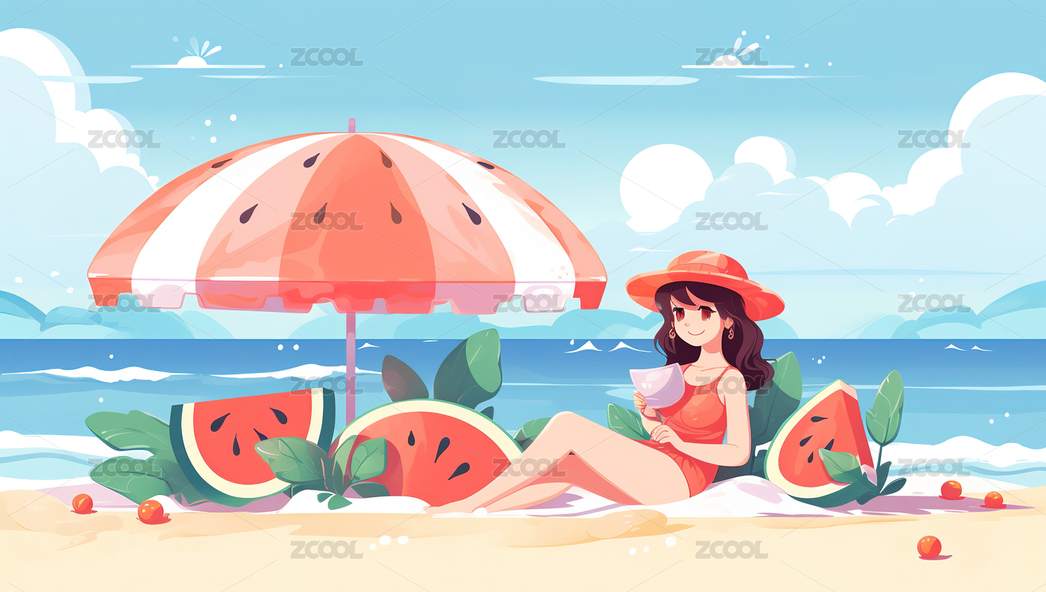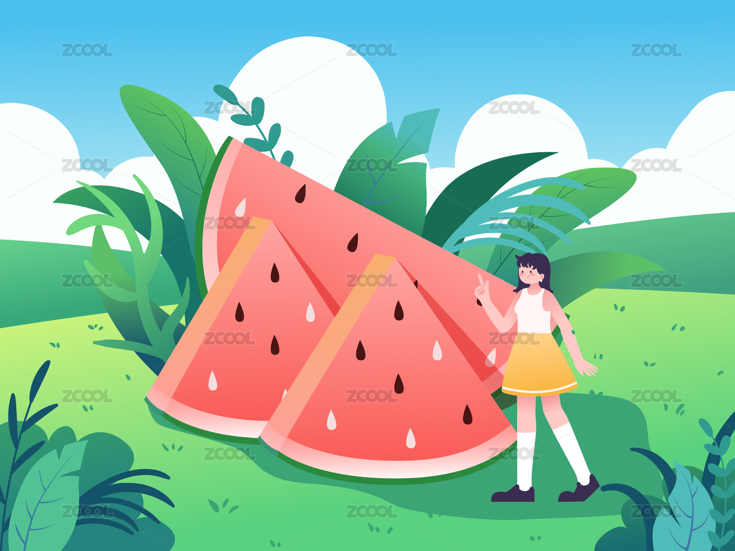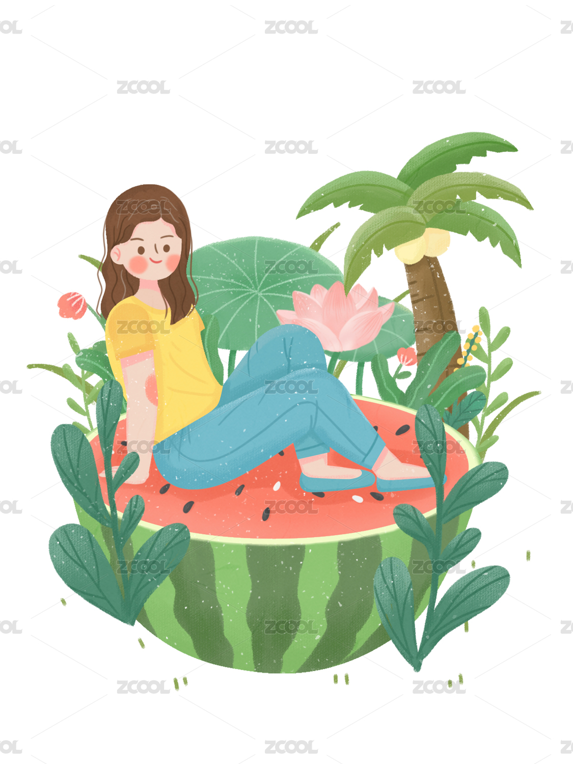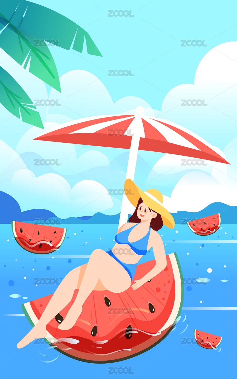 夏天人物清凉解暑插画夏日饮料西瓜美食海报