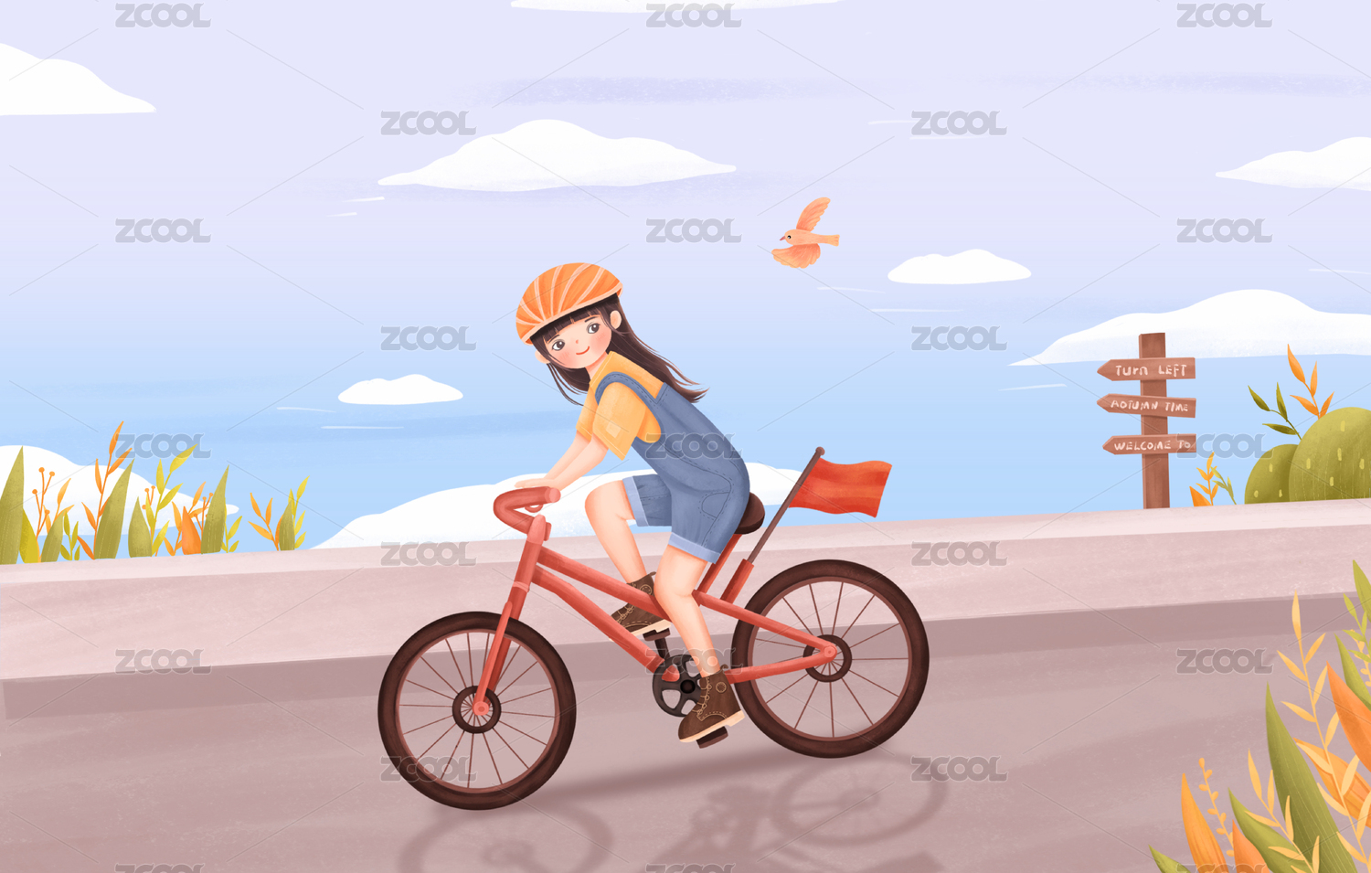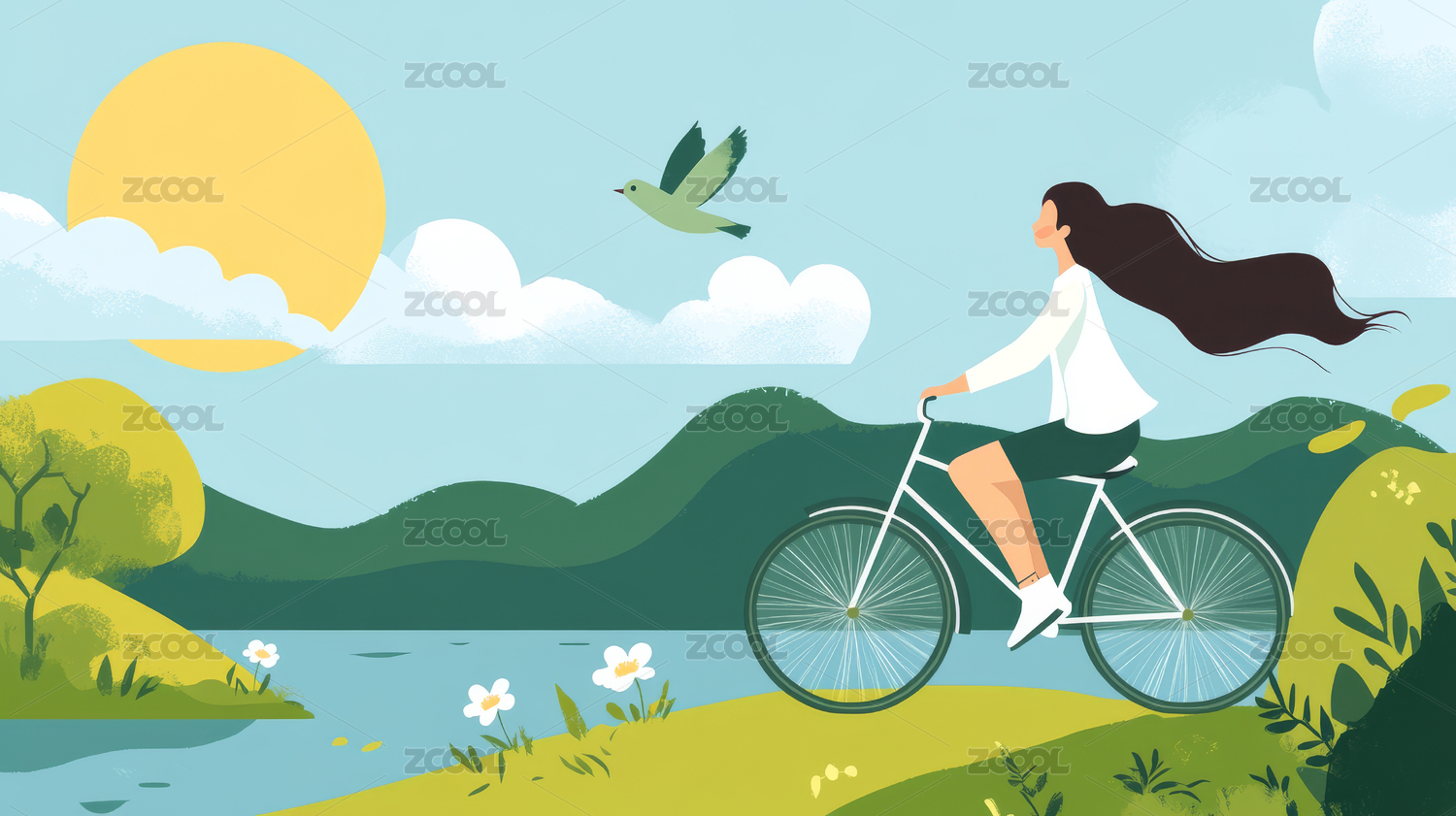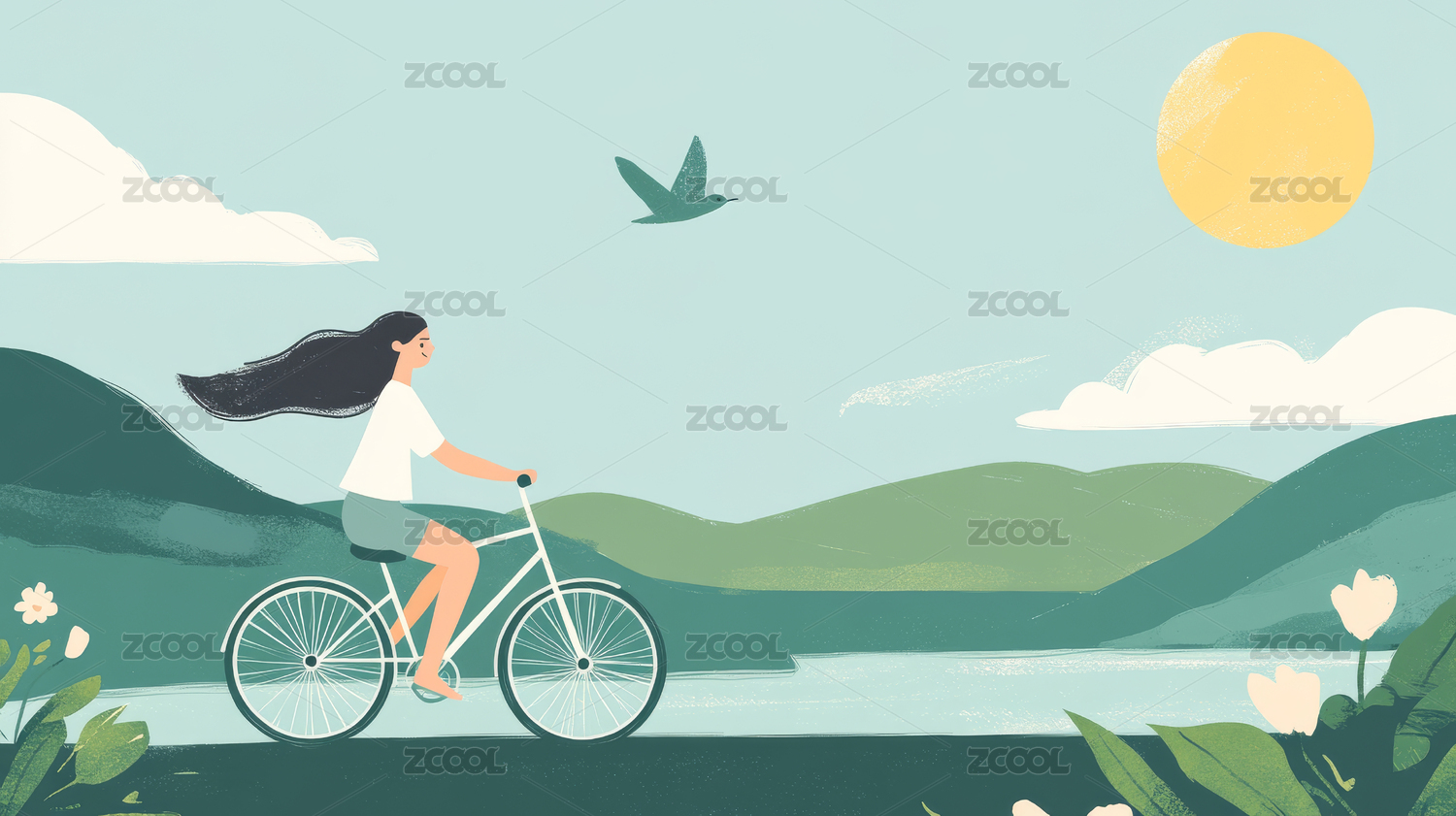 女孩在开满菊花的湖边骑车的竖版矢量插画