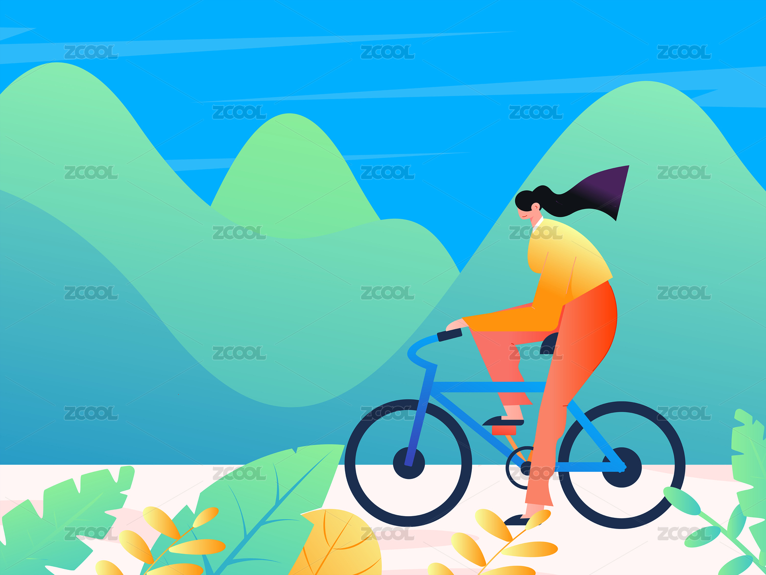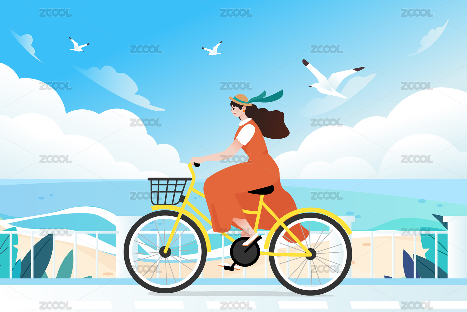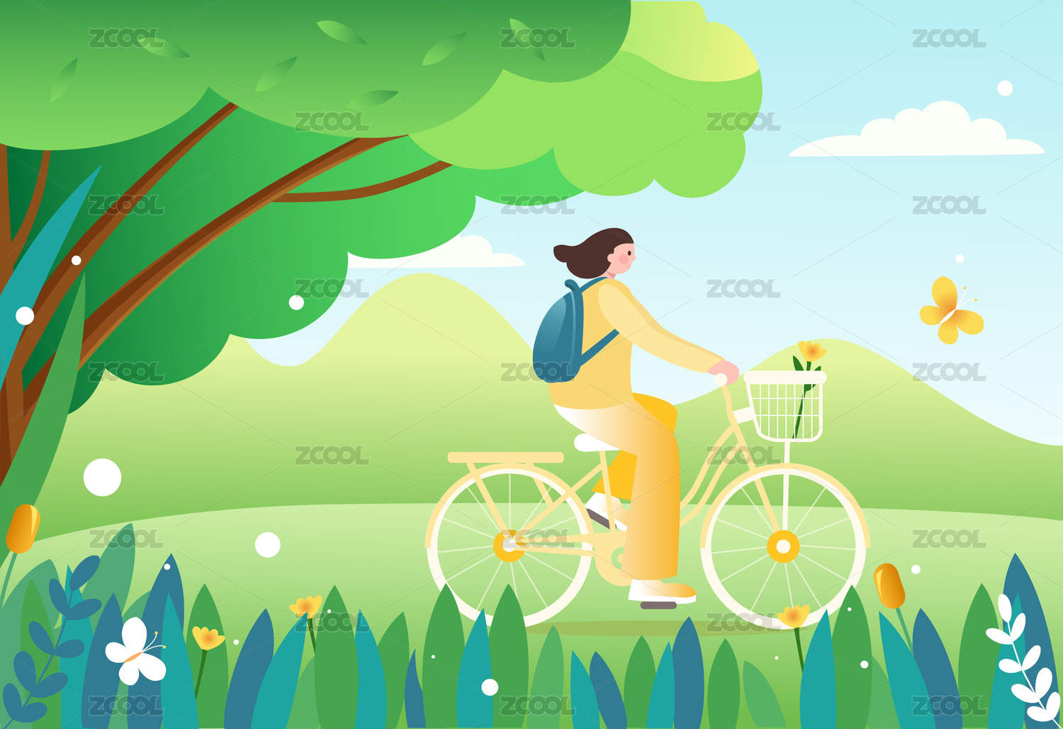 女孩在开满菊花的湖边骑车的竖版矢量插画