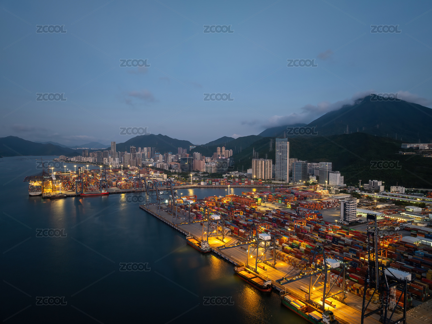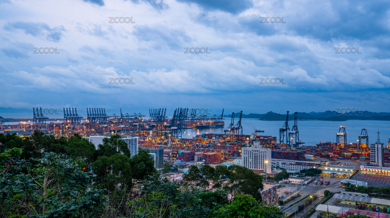 深圳盐田港繁忙港口货物集装箱夜景蓝调航拍