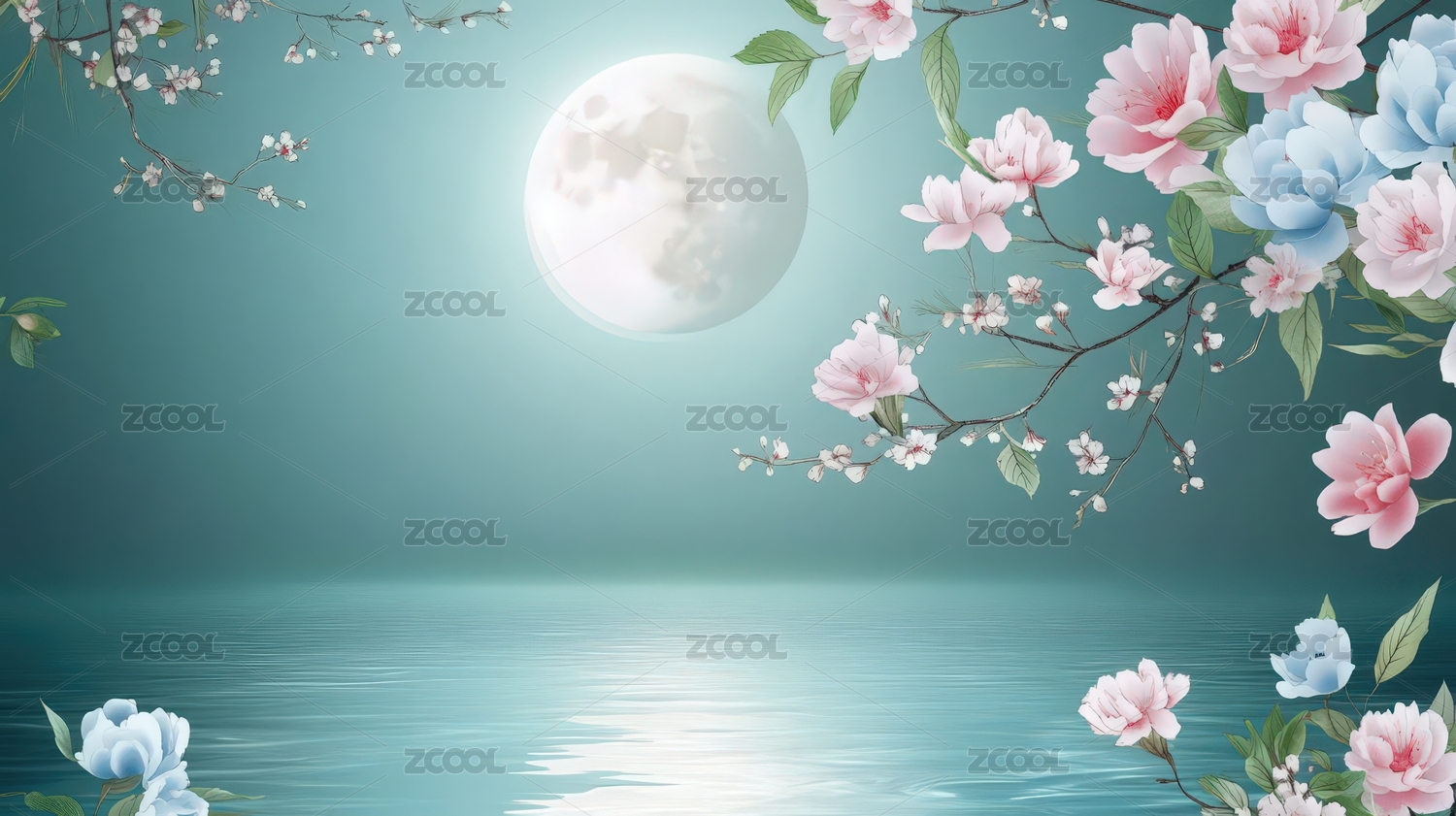 月下繁花水波静谧夜景