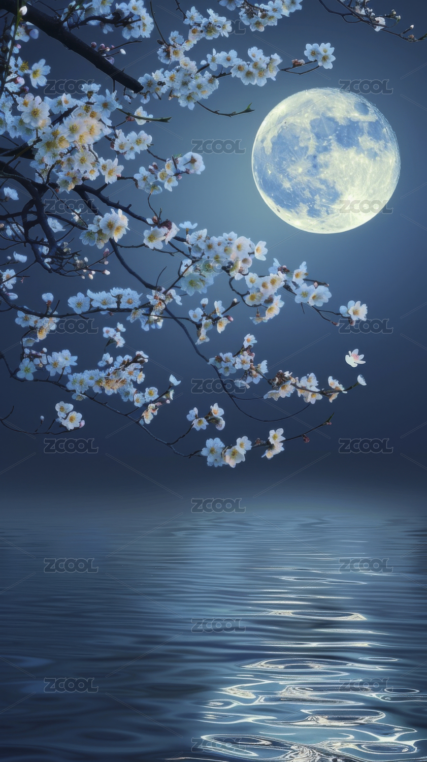 月夜花枝宁静水面