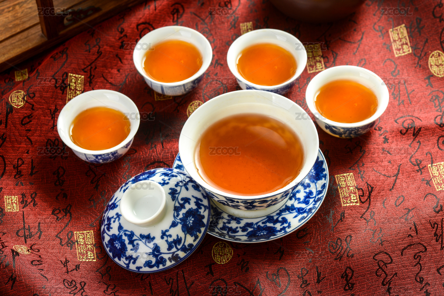 红色书法背景上青花瓷茶具里的红茶