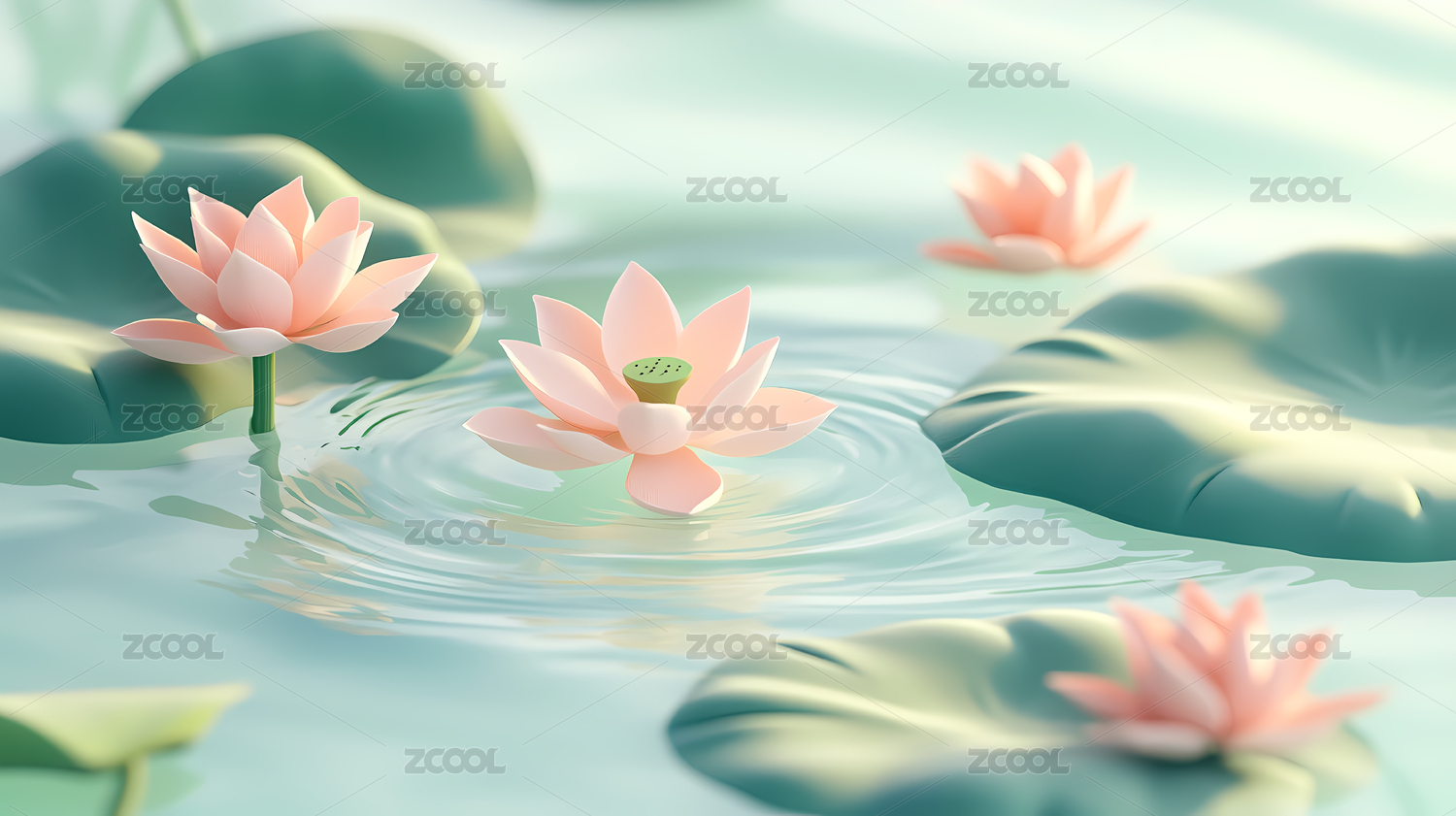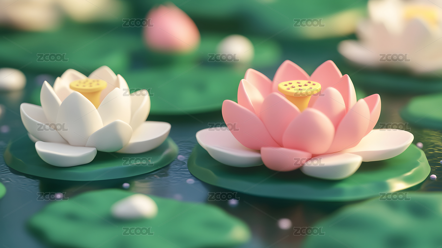 3D卡通,荷叶,荷花背景,花朵,水面上