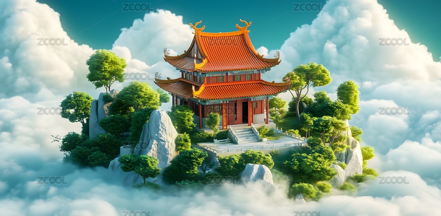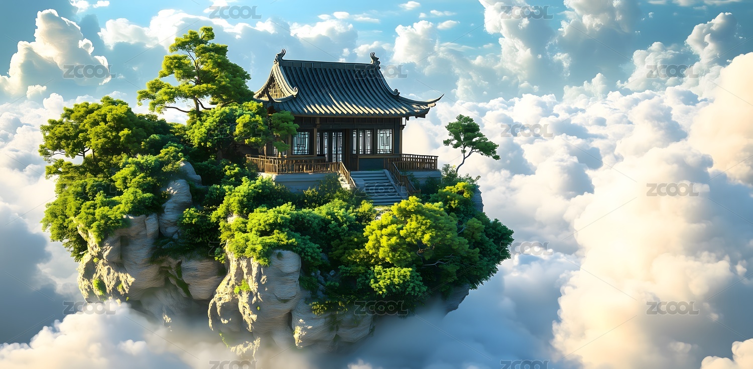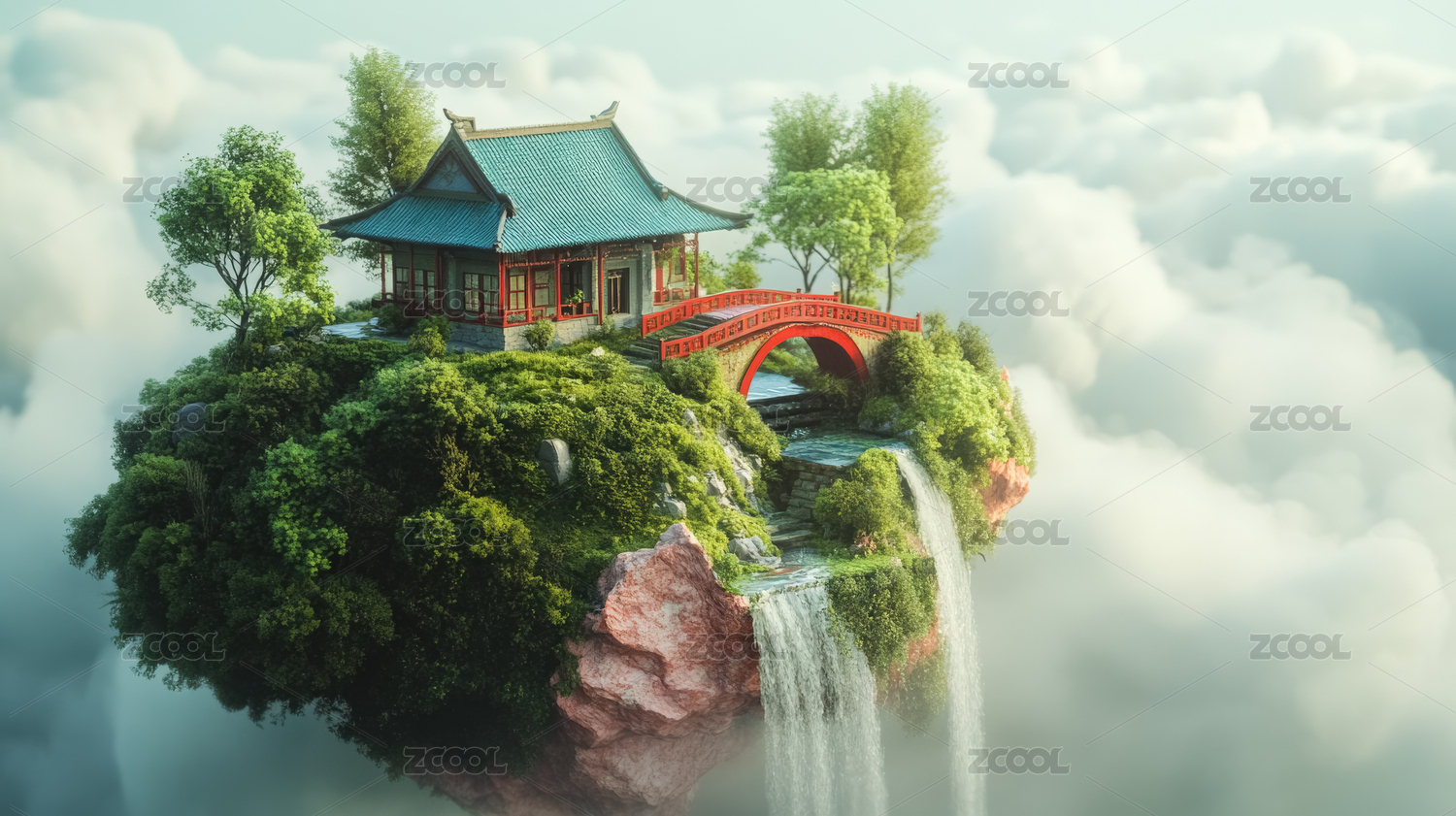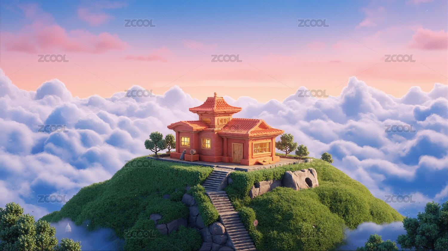 奇幻神话清新漂浮在空中的仙山3D立体插画