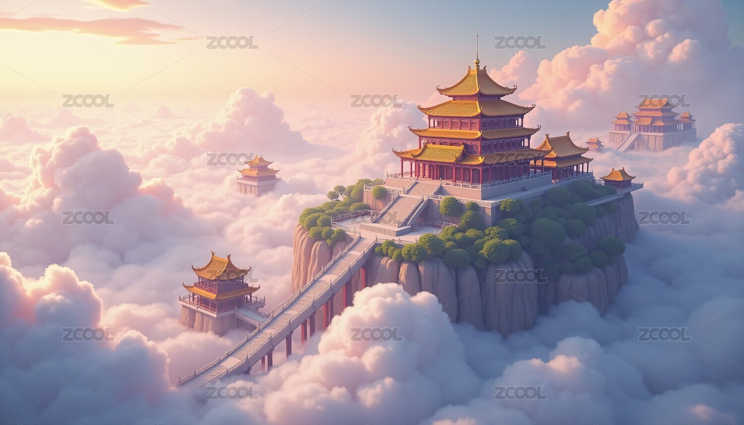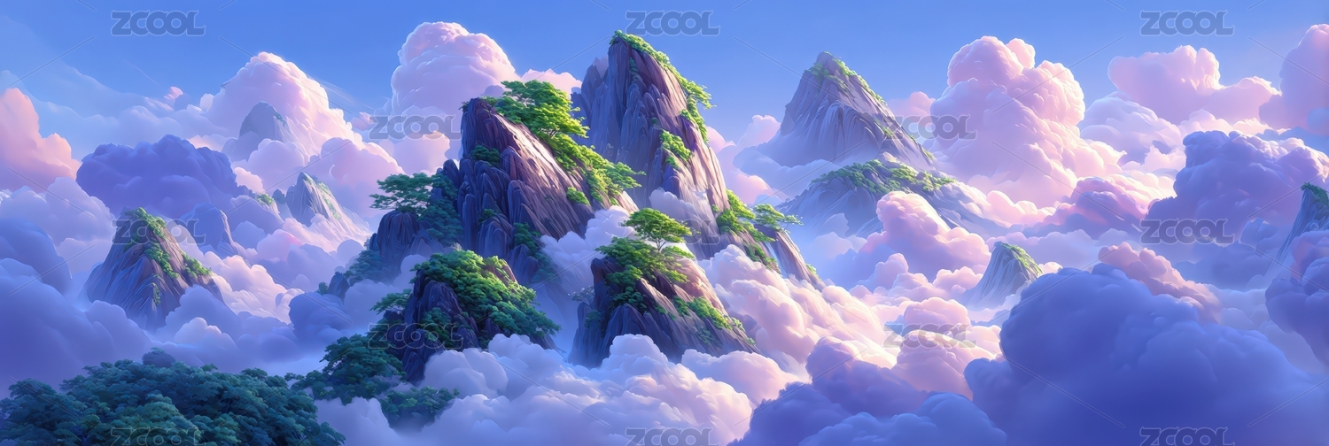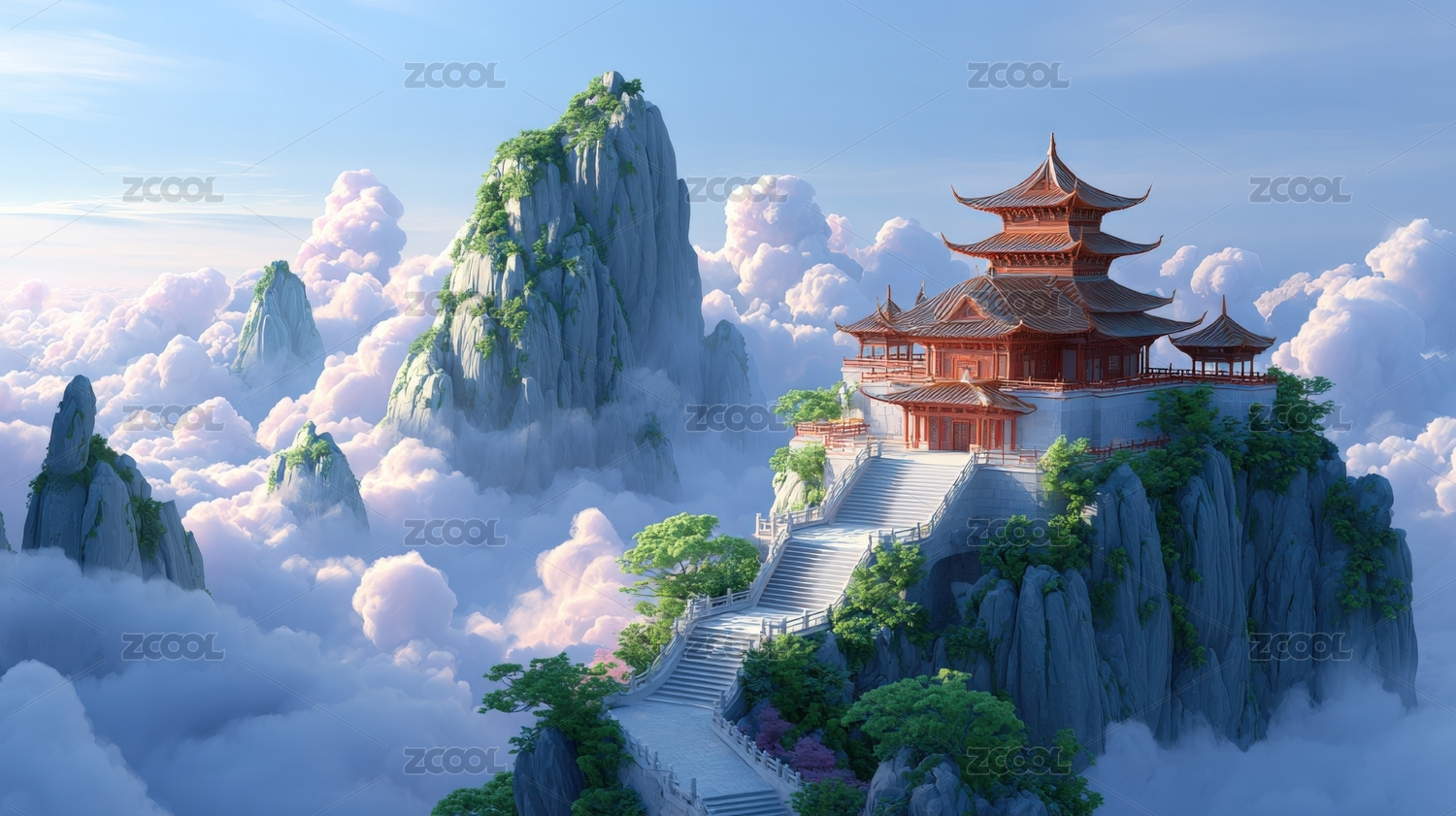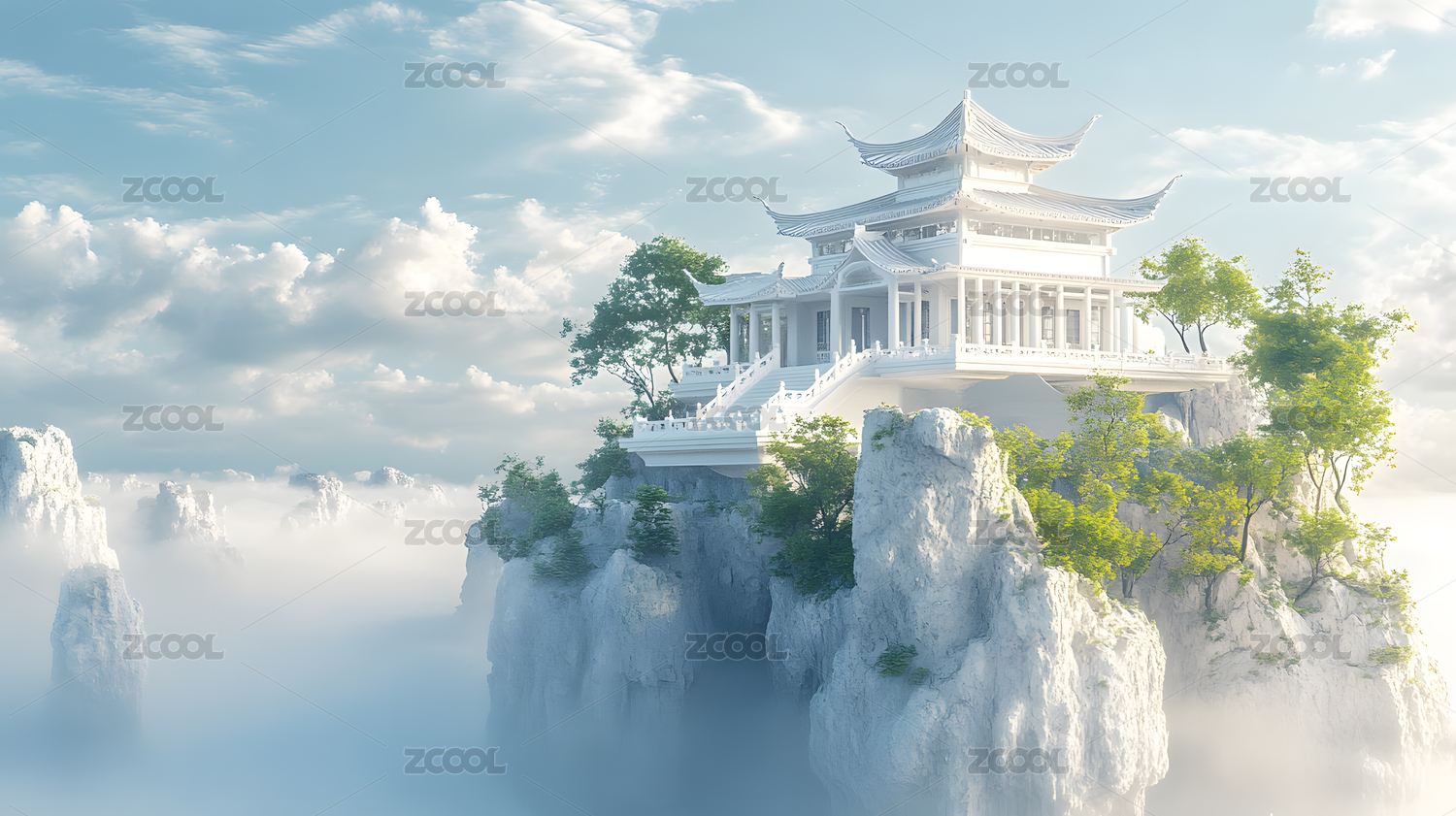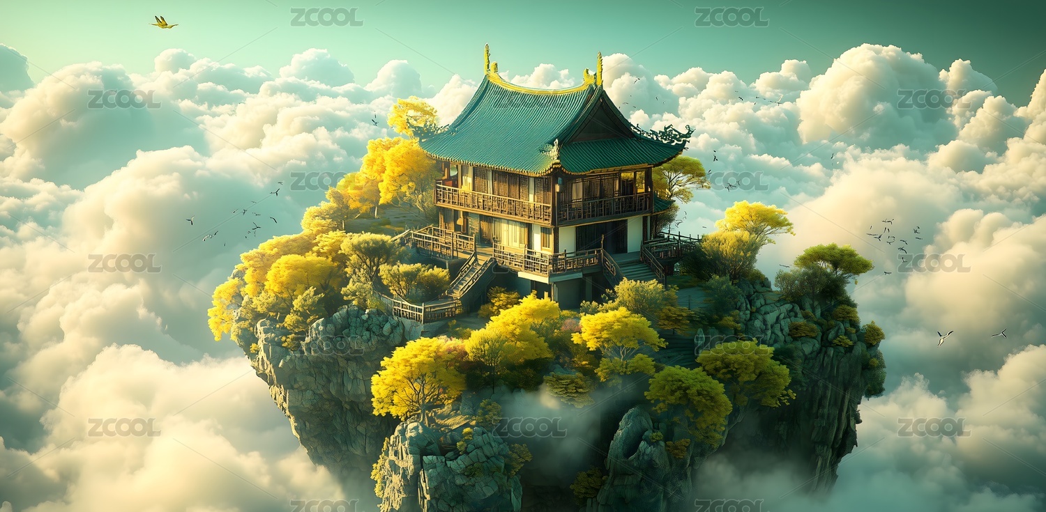 奇幻神话清新漂浮在空中的仙山3D立体插画