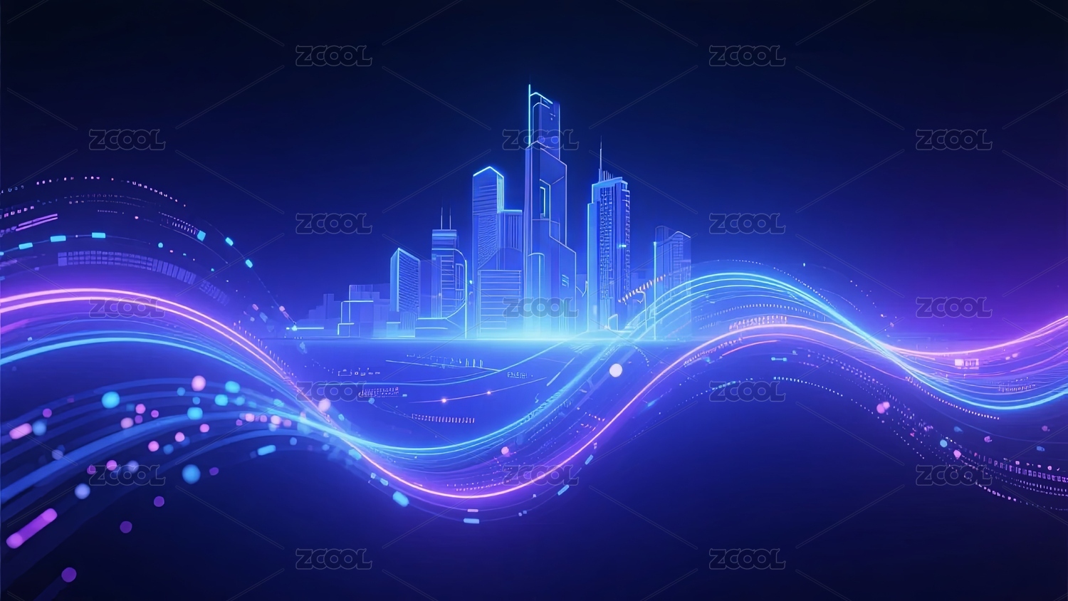 抽象数据流线条发光未来城市轮廓蓝紫色渐变