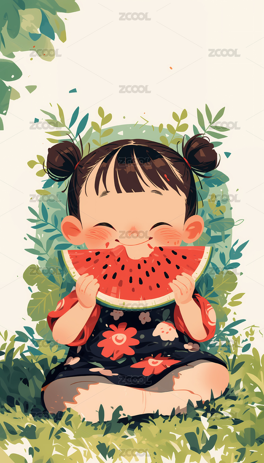 一个可爱的小女孩吃西瓜绿叶夏季插画