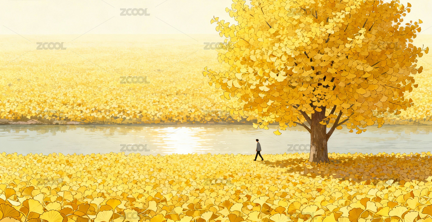 秋日湖畔行人与金黄树木