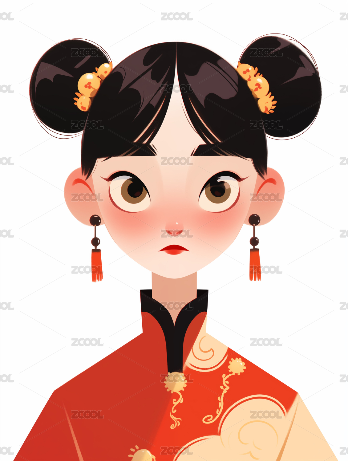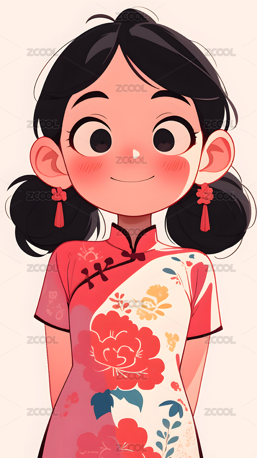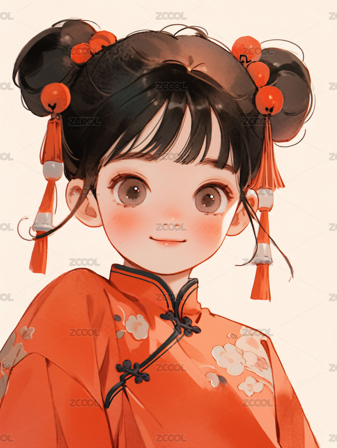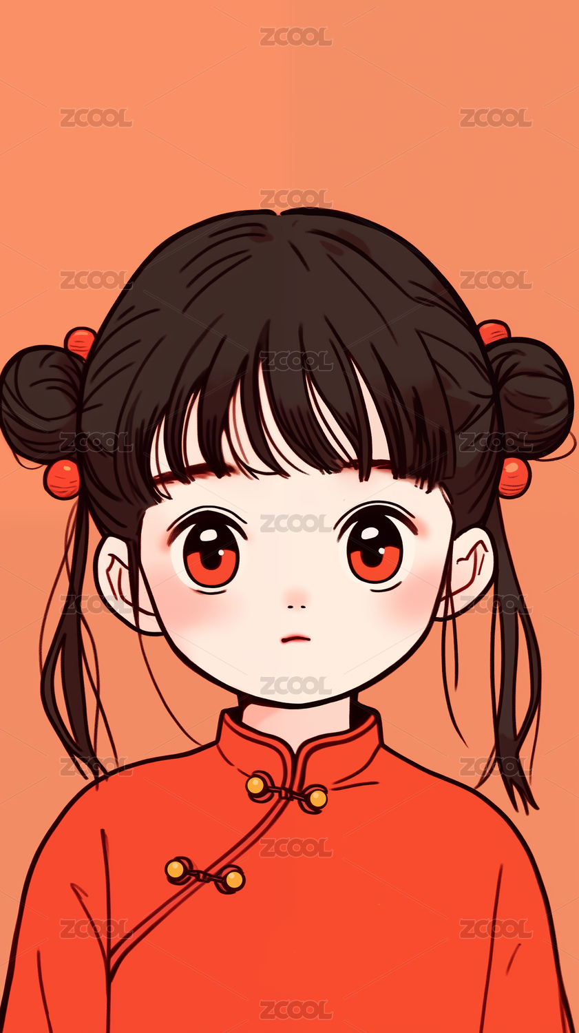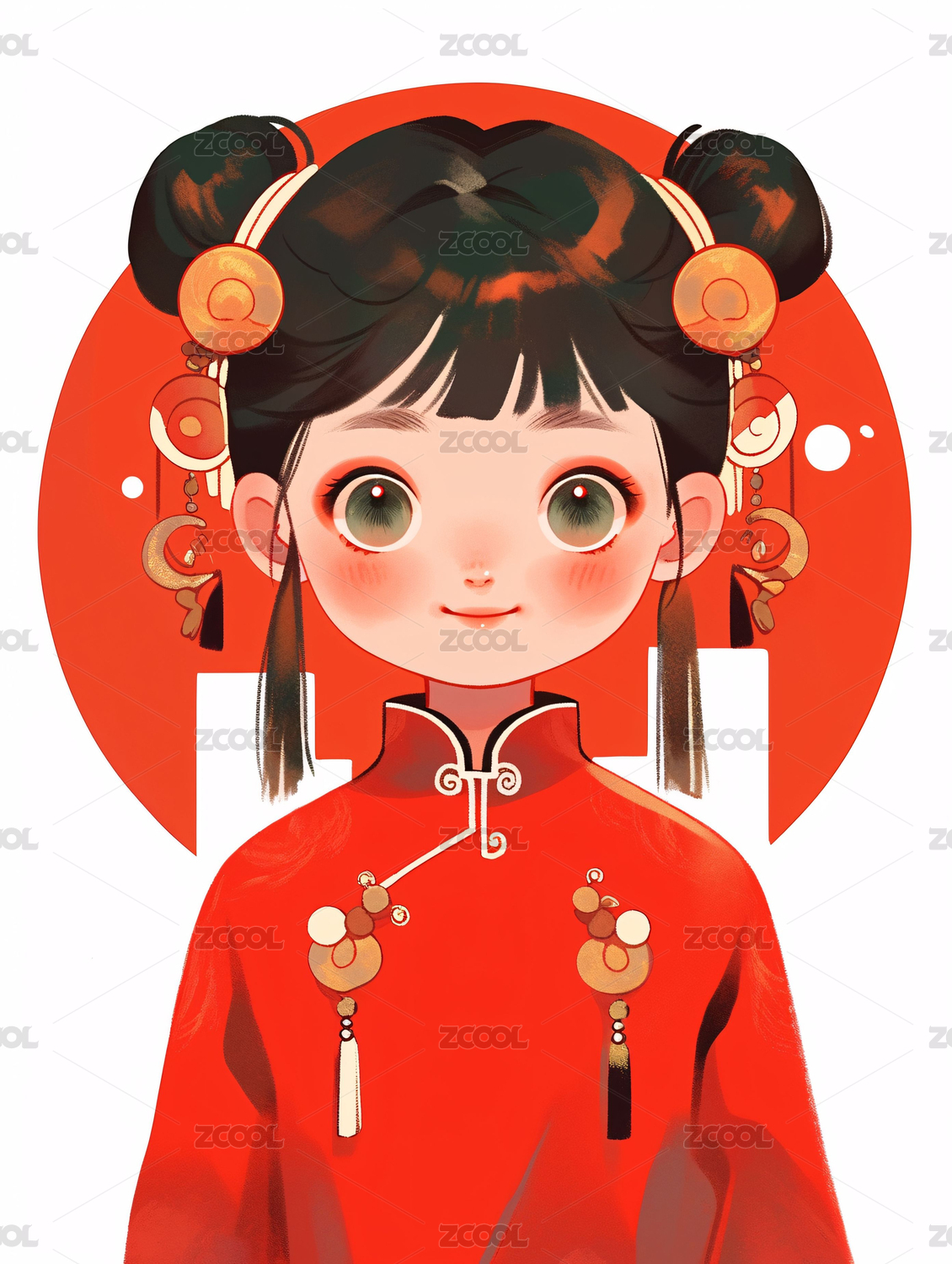 手绘卡通可爱的穿着红色唐装的女孩插画