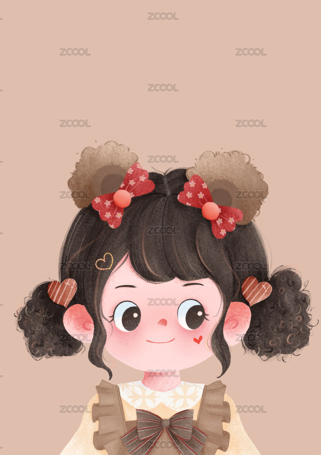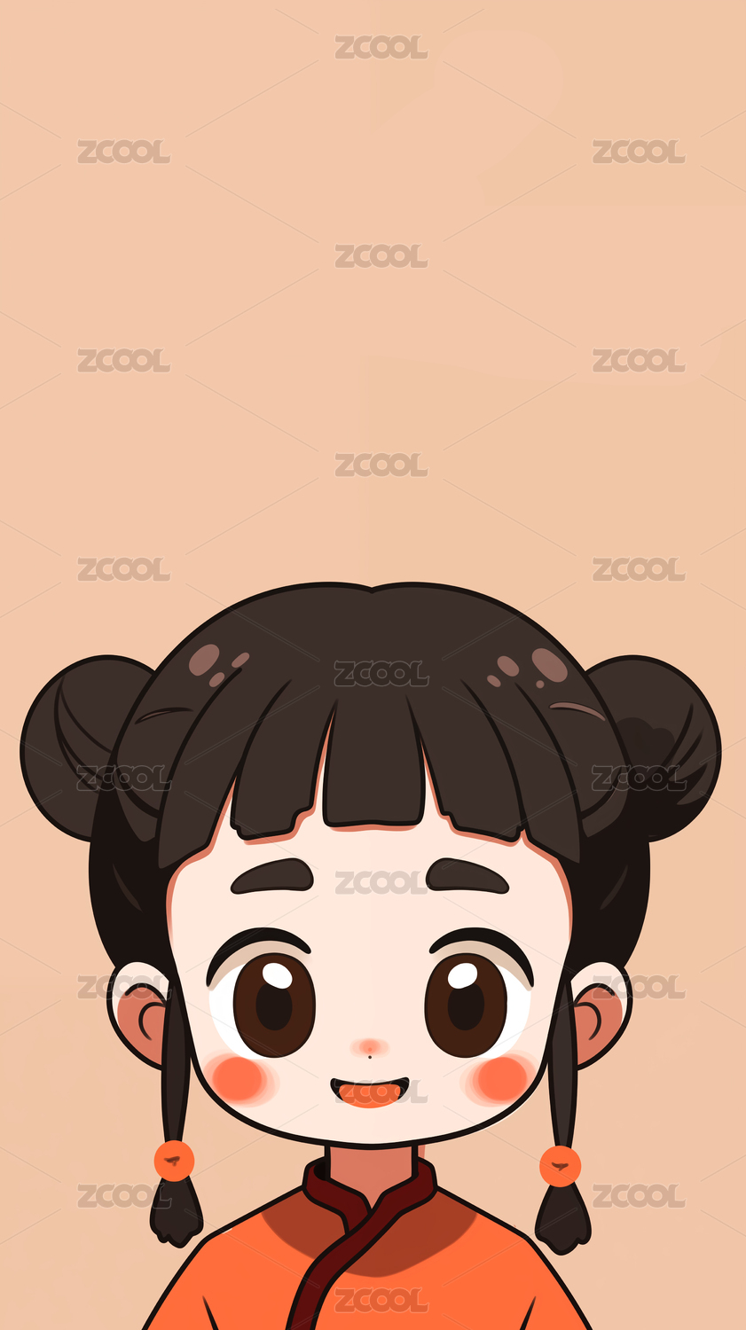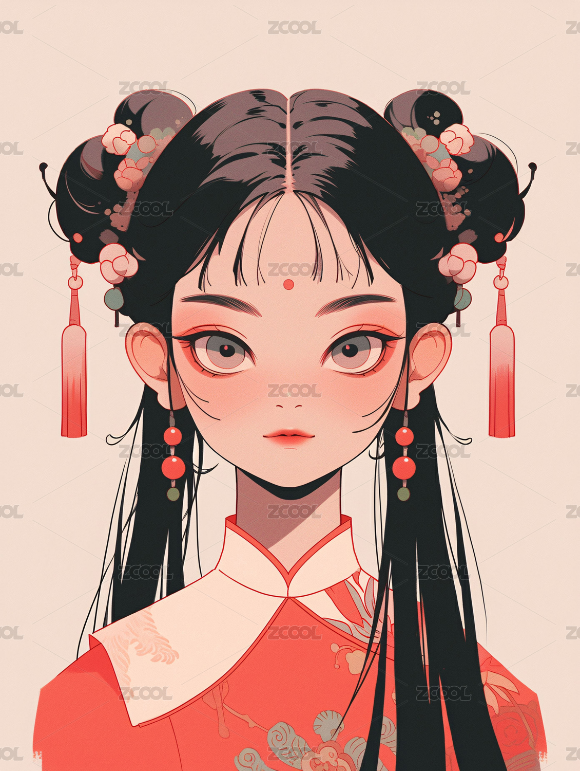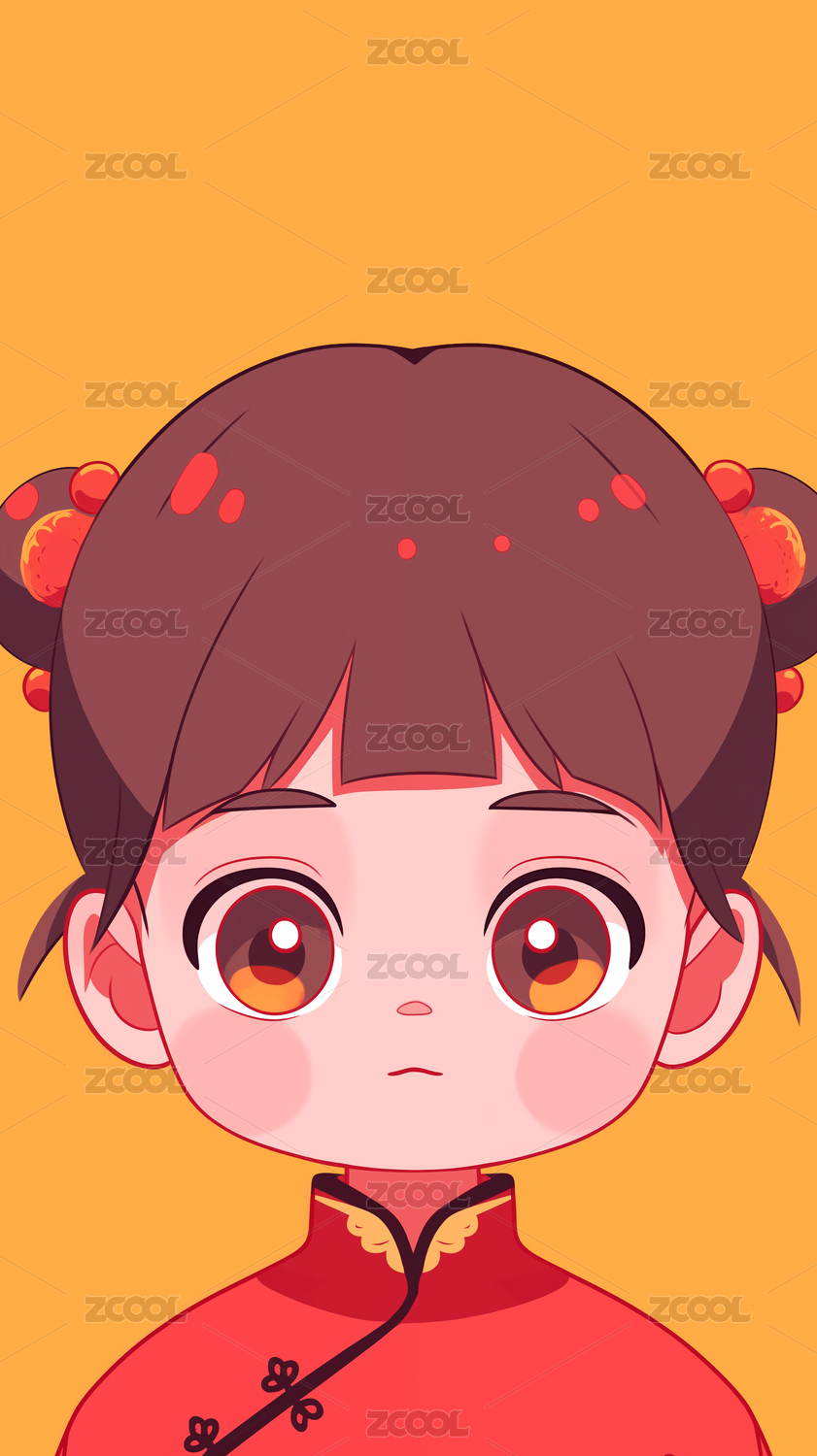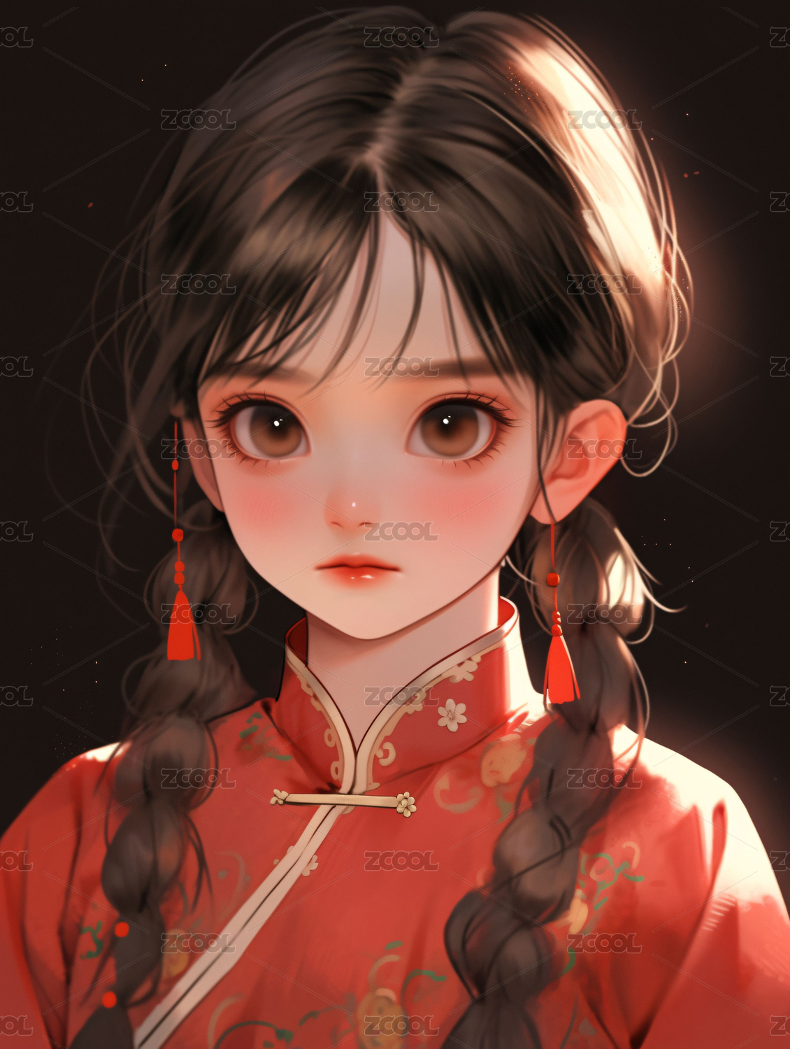 手绘卡通可爱的穿着红色唐装的女孩插画