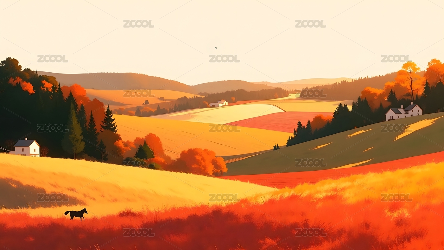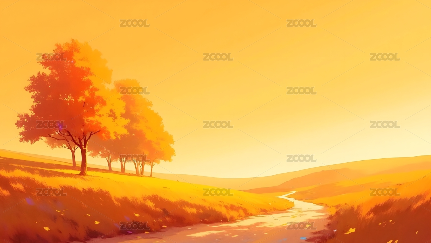 自然, 风景, 宁静, 树木, 丘陵, 橙色, 乡村, 绘画,秋季, 金色