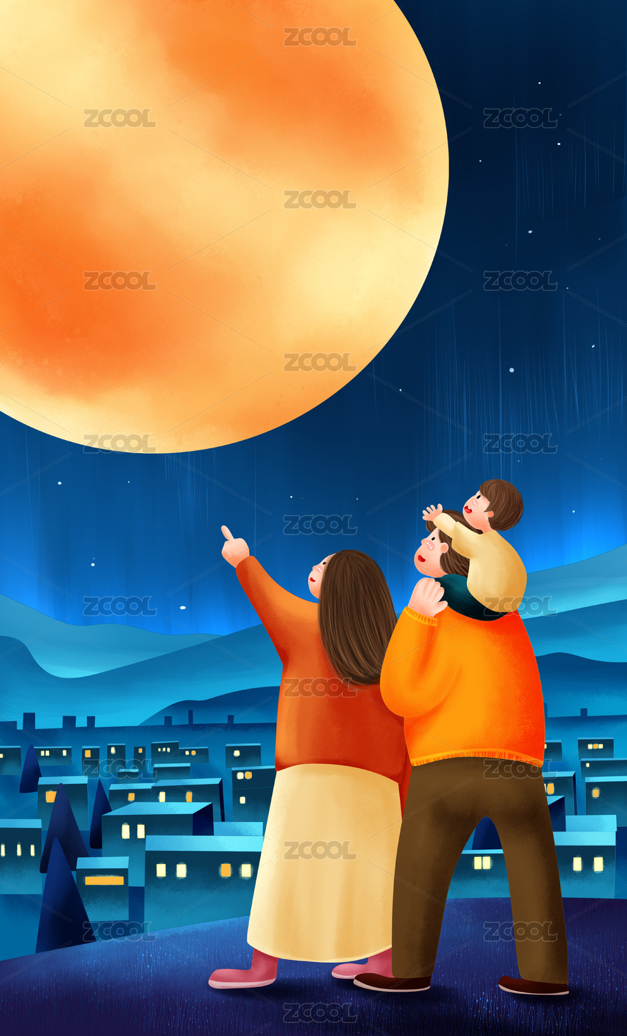 中秋佳节家人共聚一堂赏月拍月亮插画