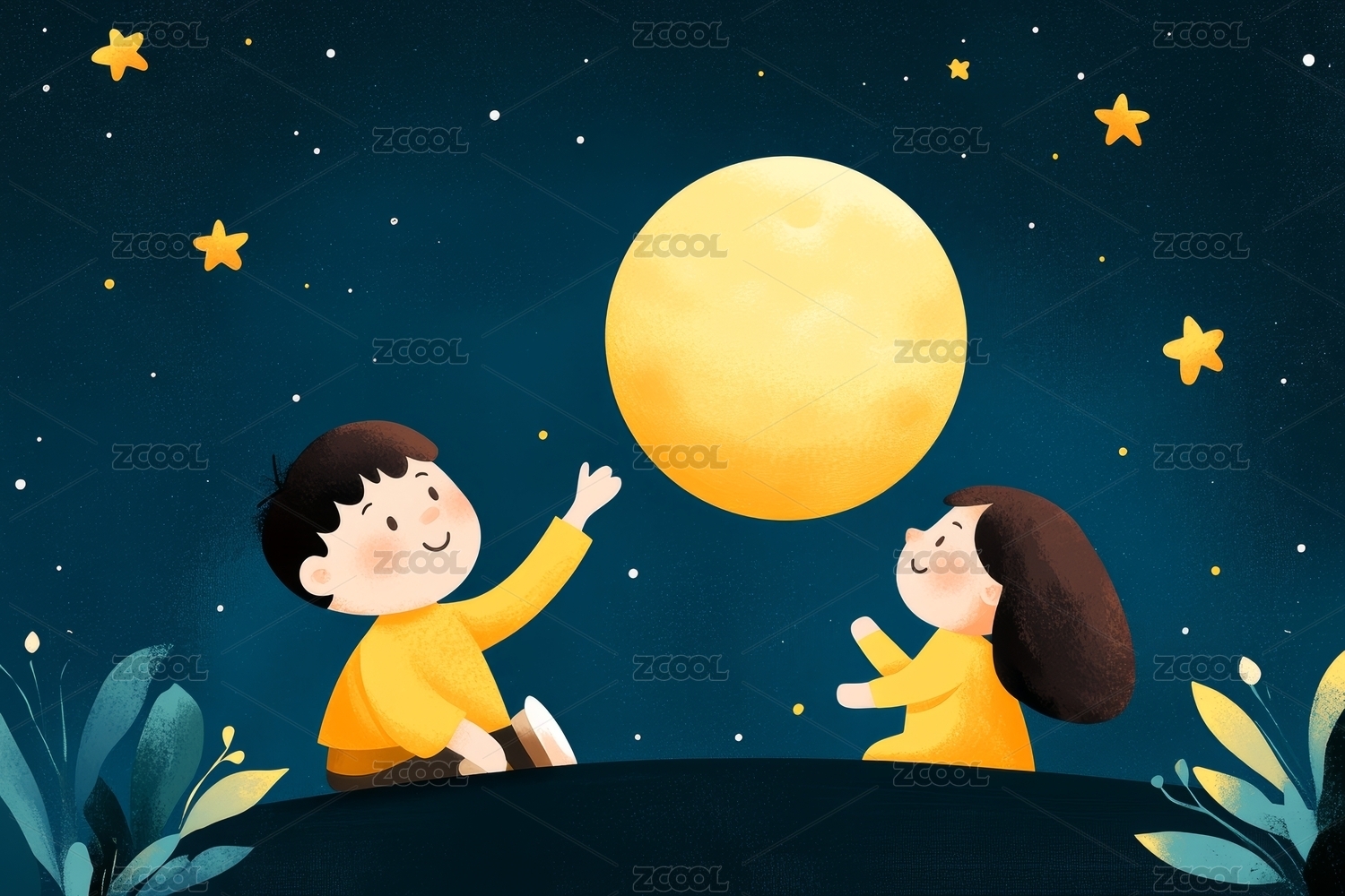 中秋夜孩童赏月