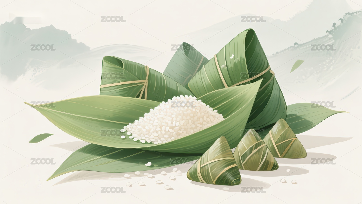 中国风粽子放在盘子上,旁边有竹叶点缀的端