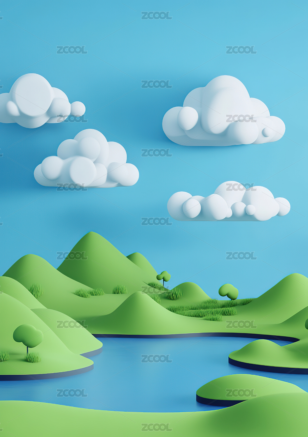 绿色的大堤中间蜿蜒的河流风景3D卡通插画