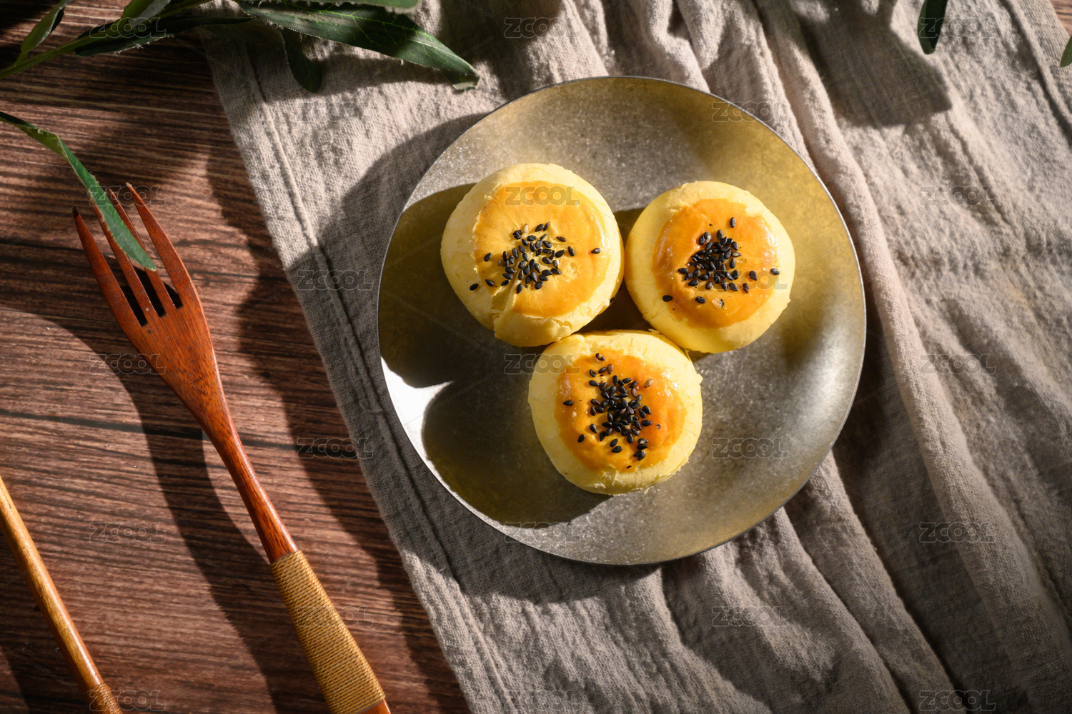 蛋,蛋黄酥,中秋,黄色,蓝色,芝麻,桌子,假日,假期,节日