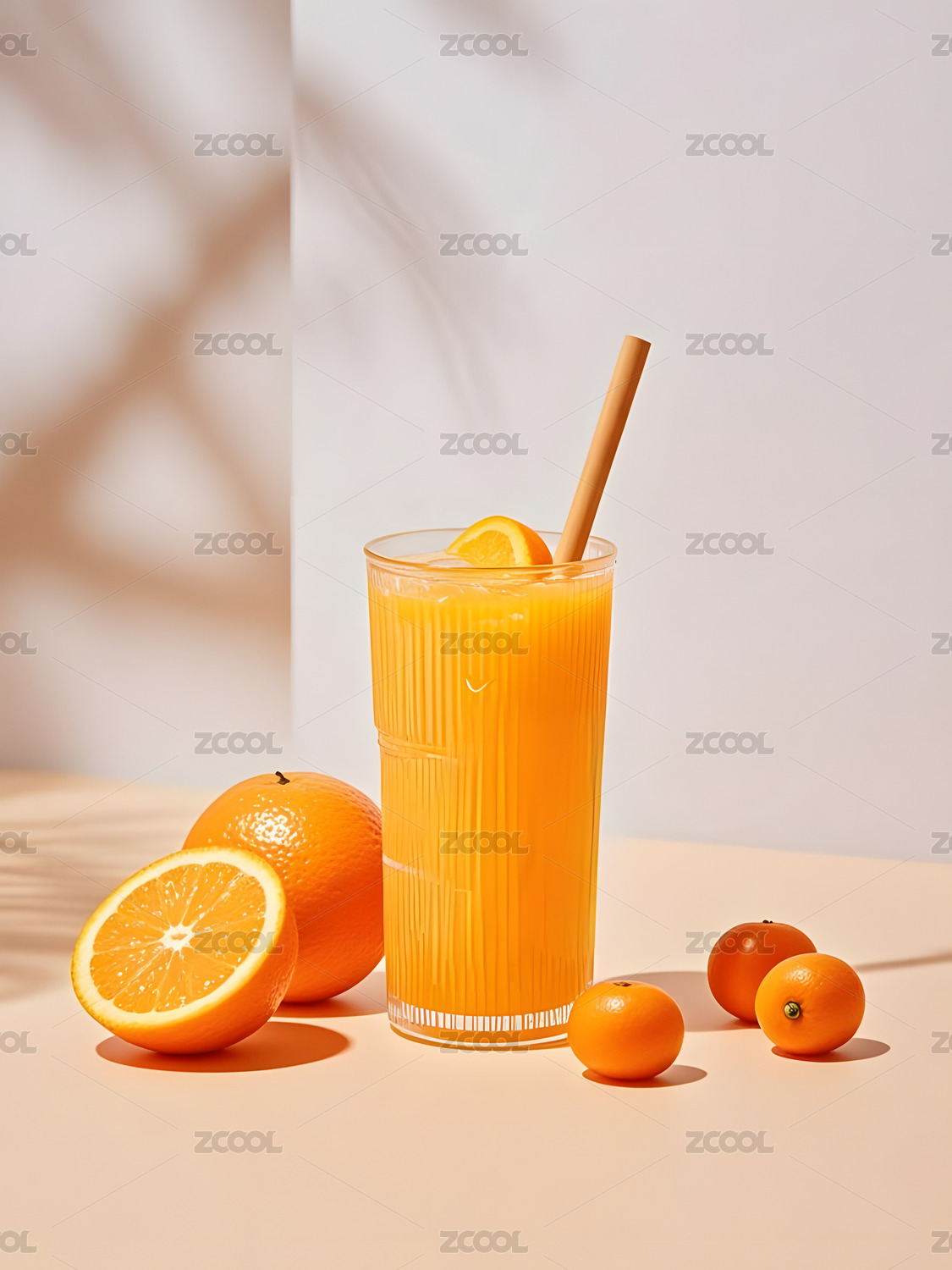 黄色背景白色桌子上放着装满黄色果汁的高脚