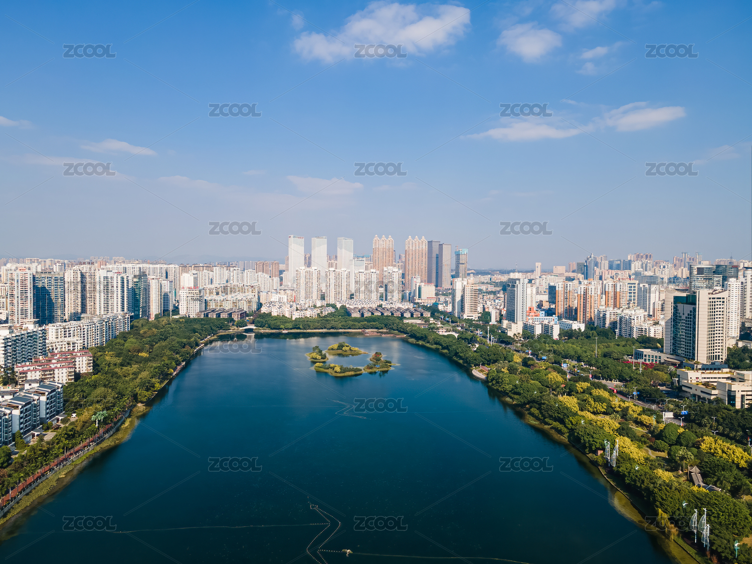 航拍郑州雕塑公园西流湖城市绿地滨湖景观带