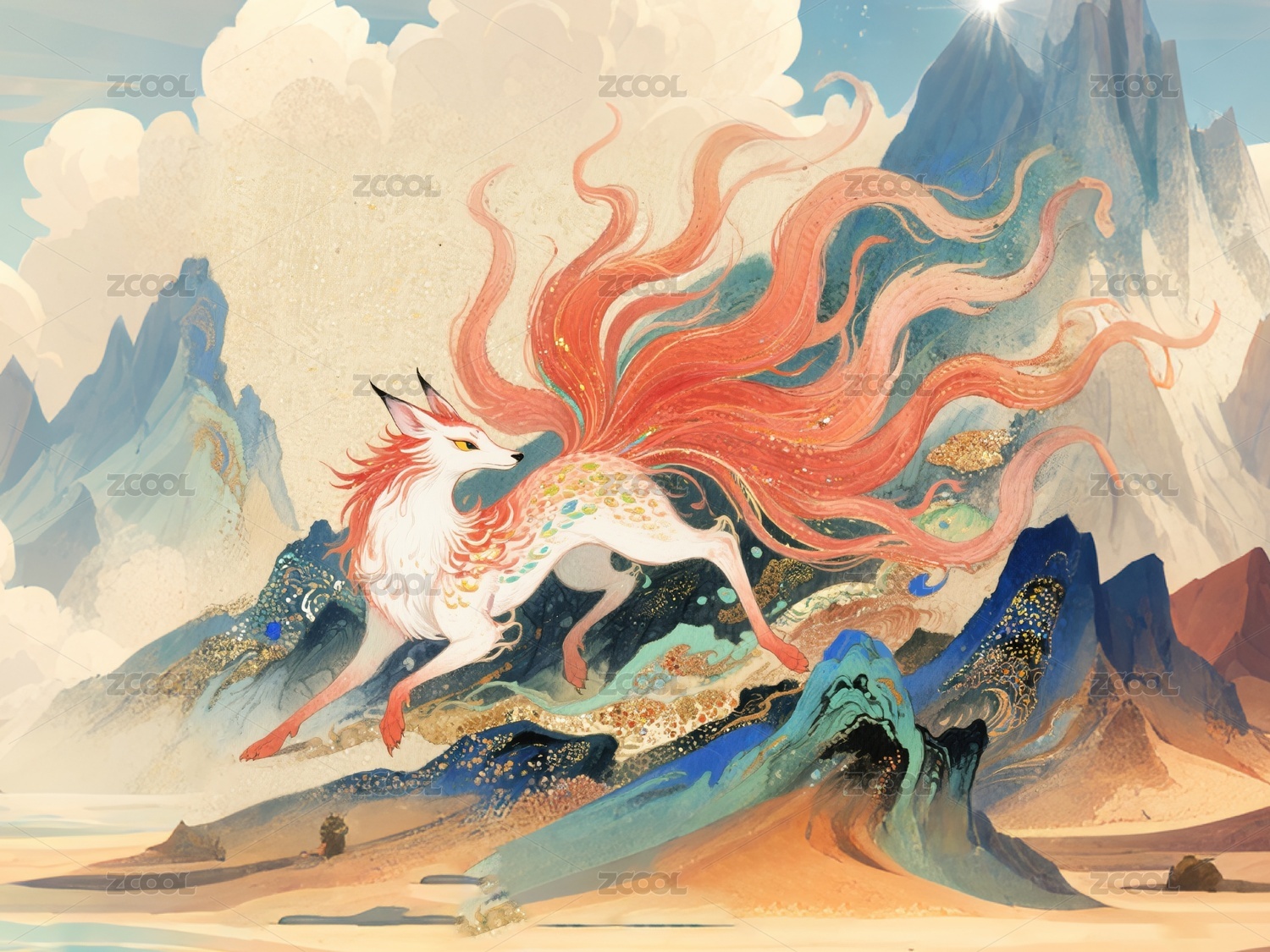 山海经神兽九尾狐插画
