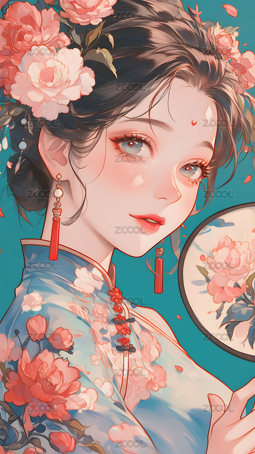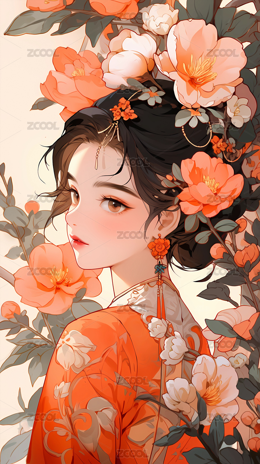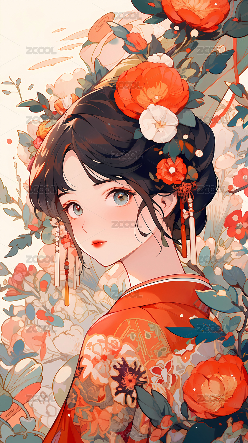中国风,女孩,花朵,红色,插画,美女,复古,古典