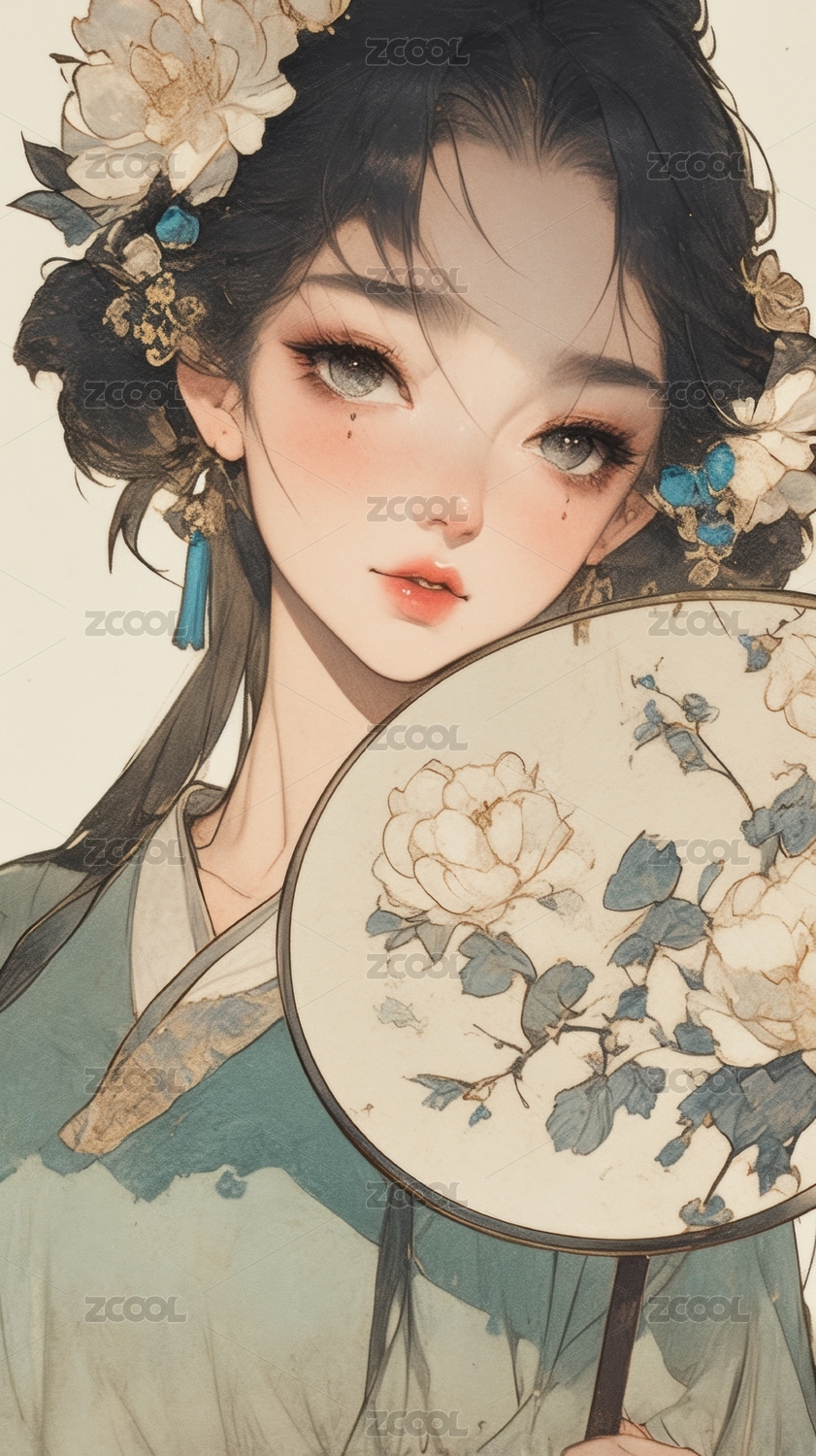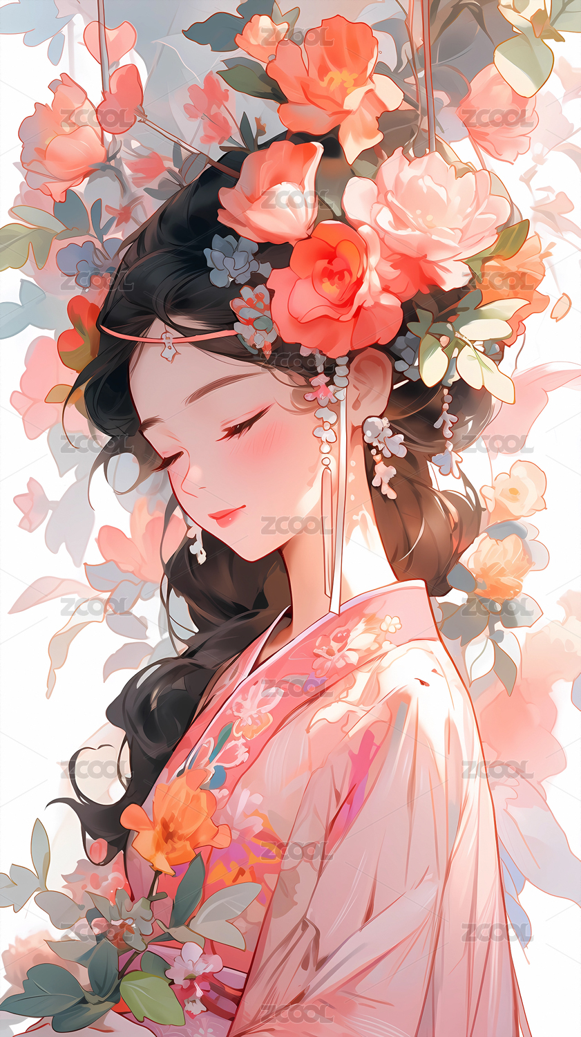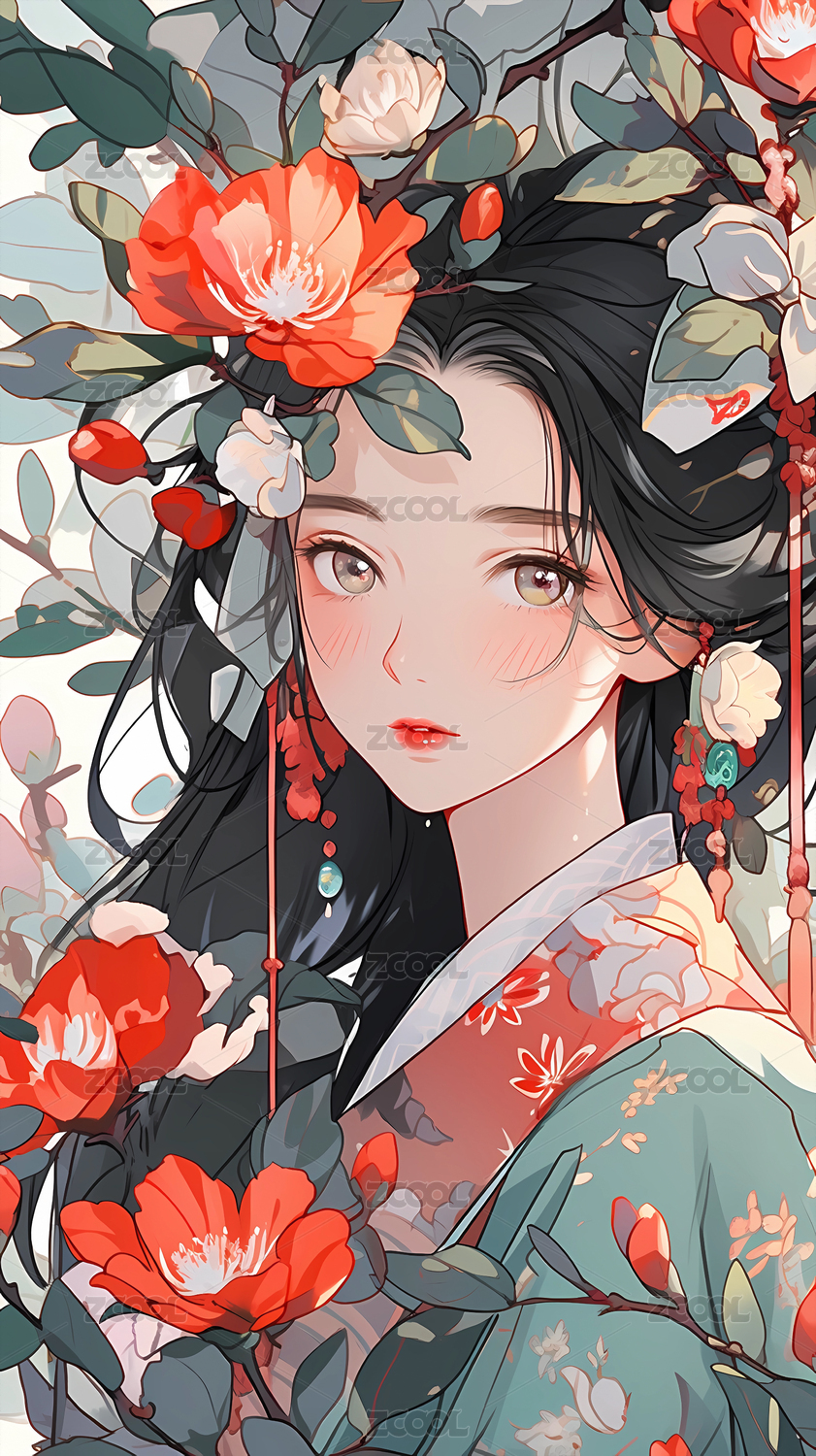 中国风,女孩,花朵,红色,插画,美女,复古,古典