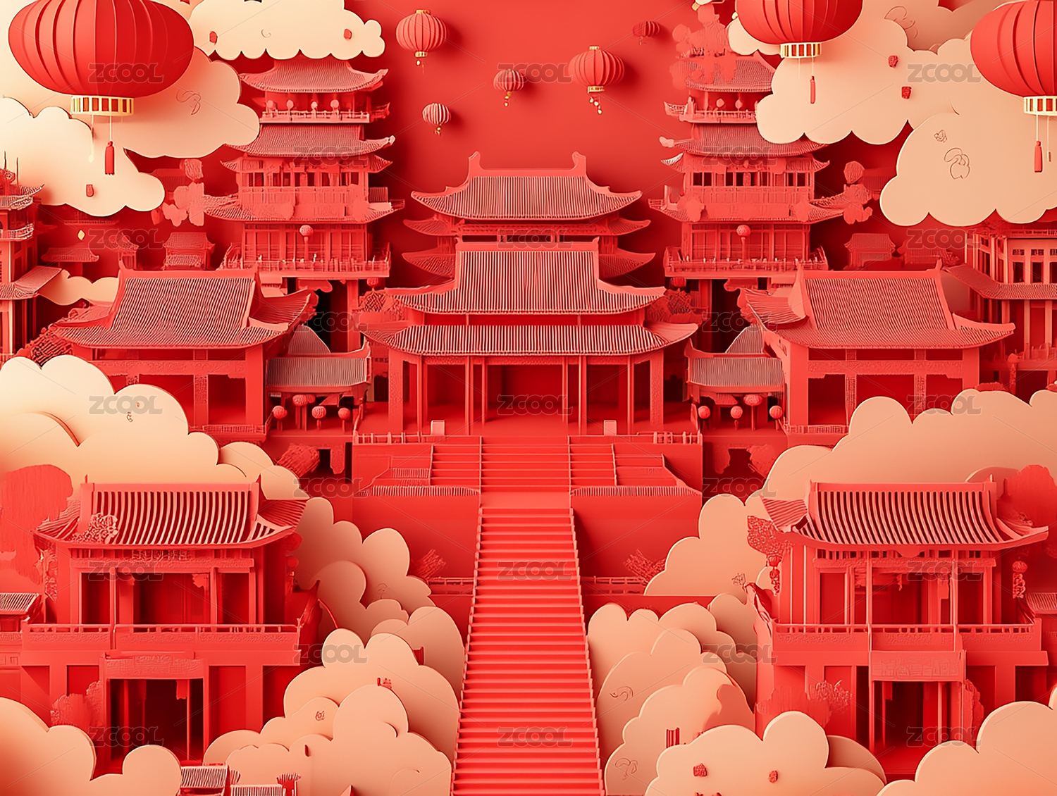 剪纸风中国古建筑红色背景新年春节喜庆庆祝