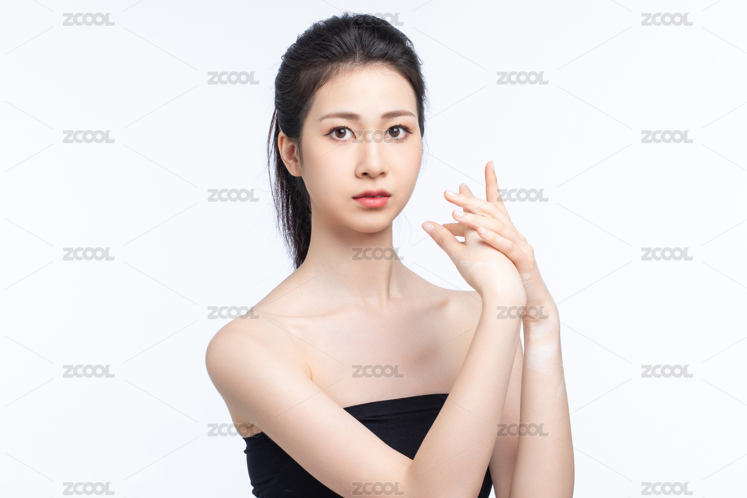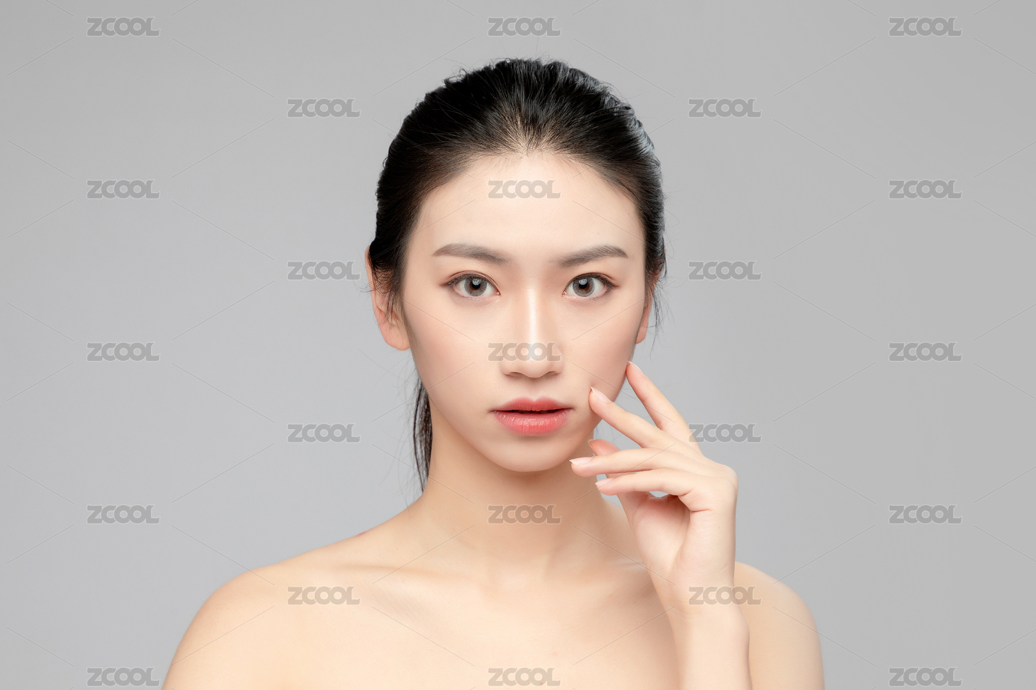 灰色背景里的亚洲美女面部特写,化妆护肤整容