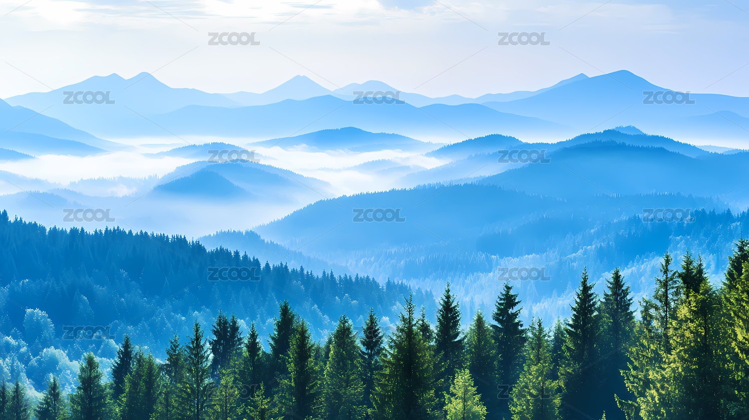 薄雾笼罩蓝绿色山谷
