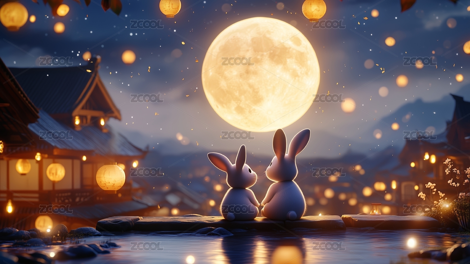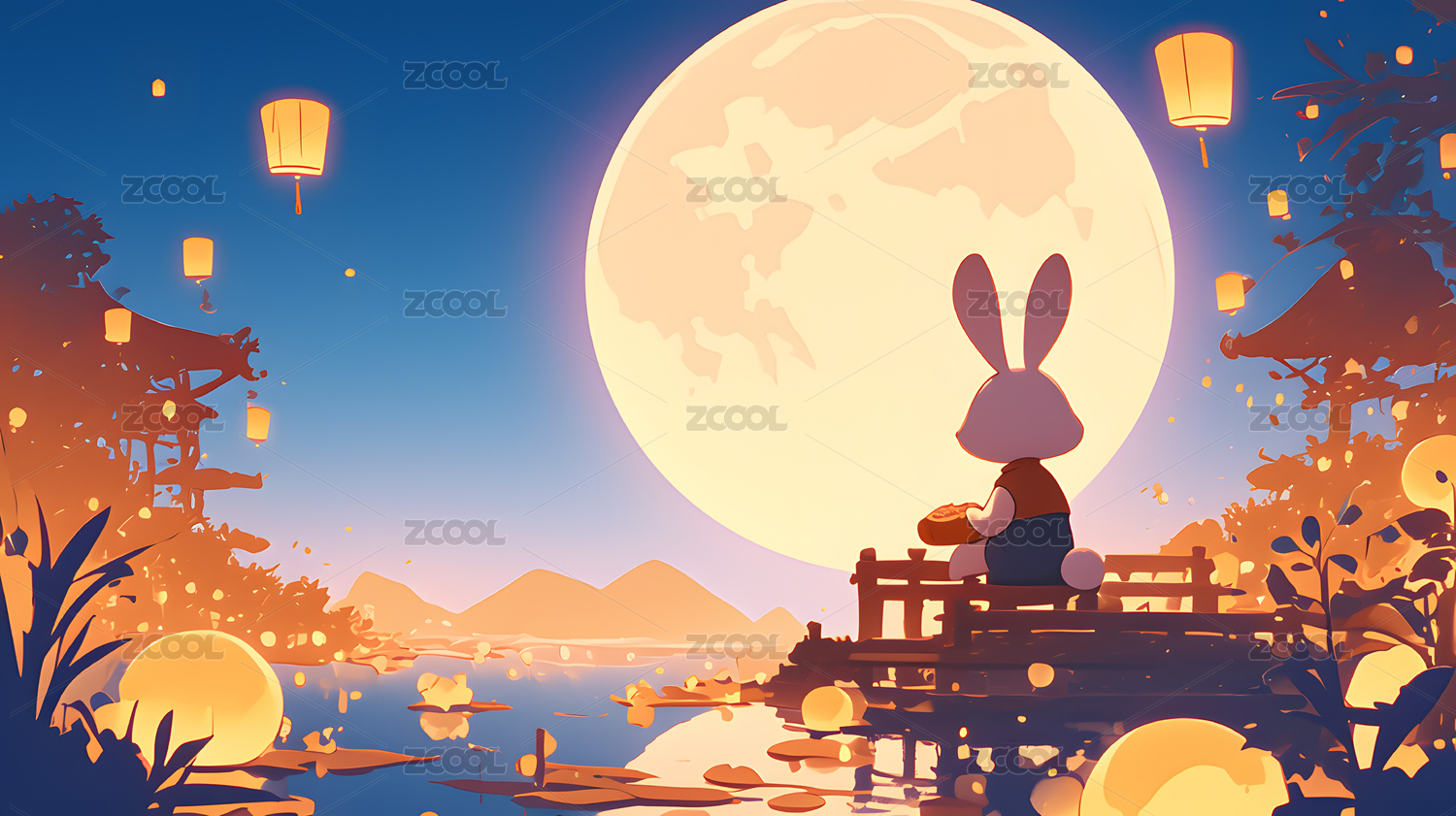 夜空的满月,白兔坐在屋顶吃月饼,中秋节