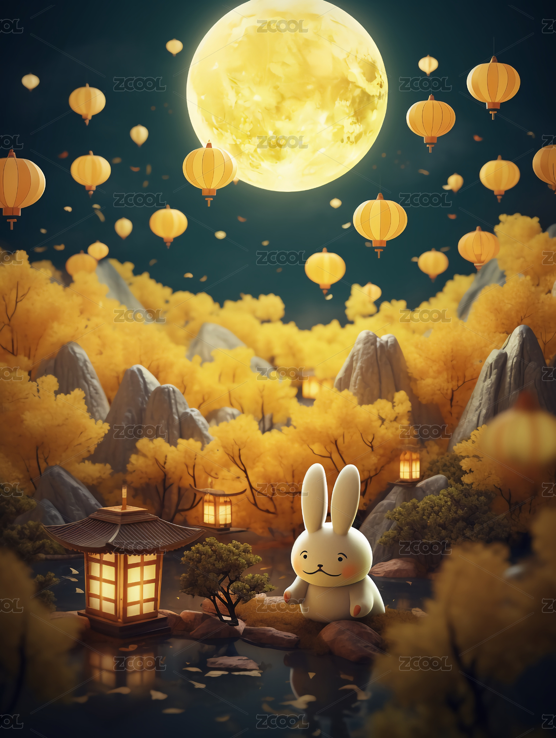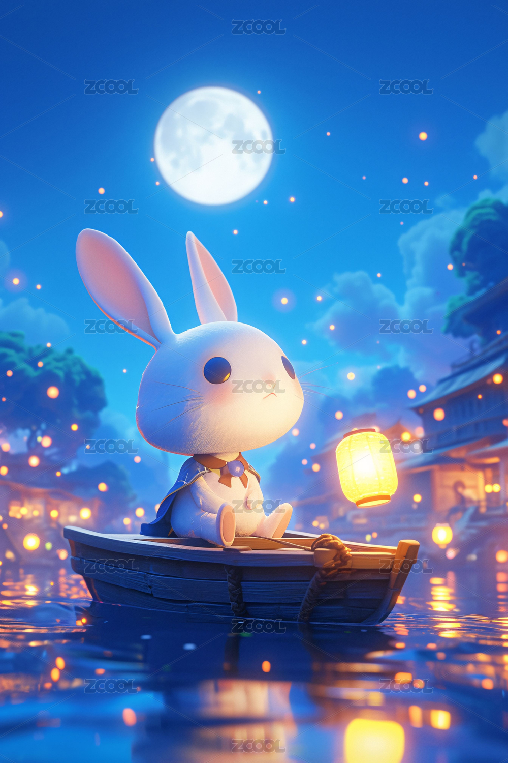 3D中秋节玉兔赏月场景插图,兔子坐在船上