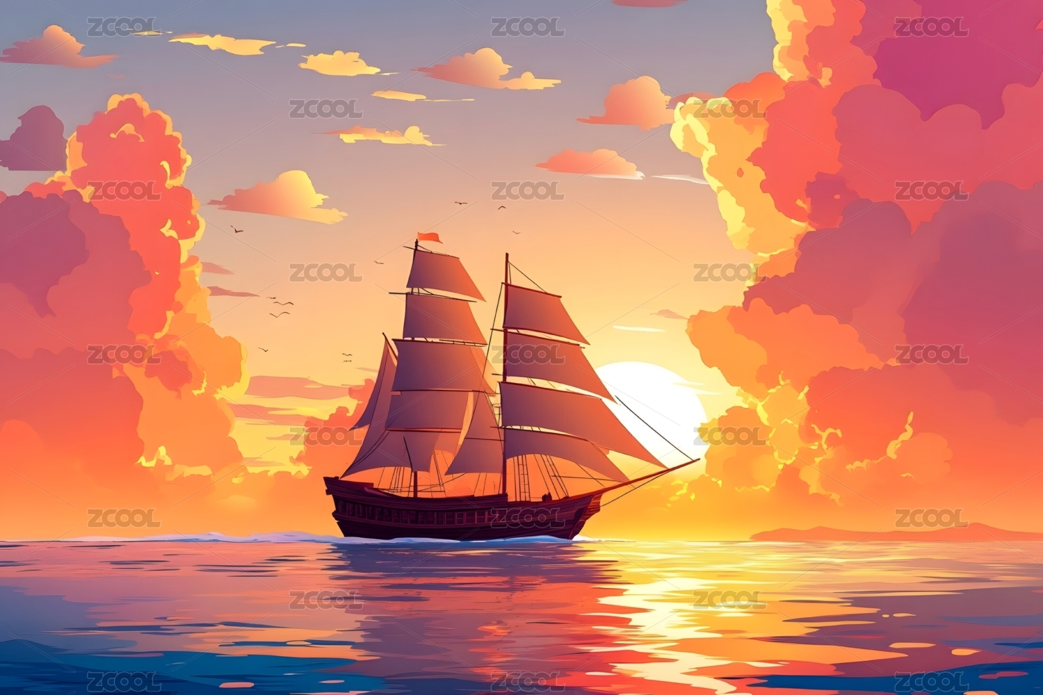 日落帆船云海行