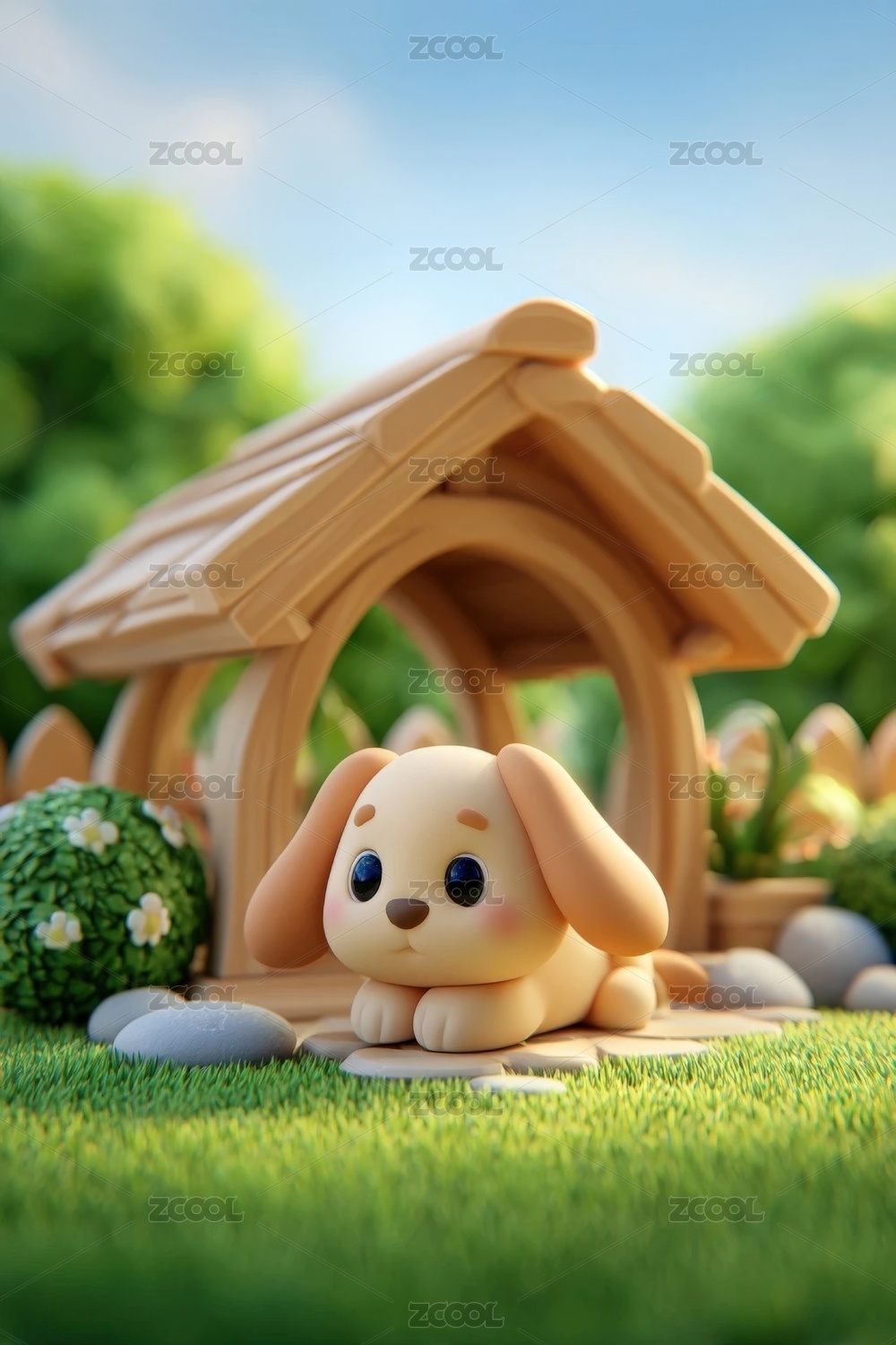 清新治愈草地的可爱小狗3D卡通立体插画
