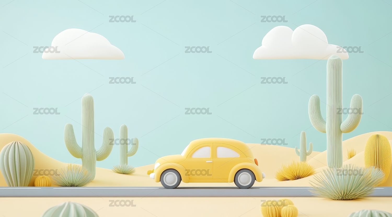 AIGC202404,3D,汽车,旅行,风景,大自然,插画,云,旅游,出行