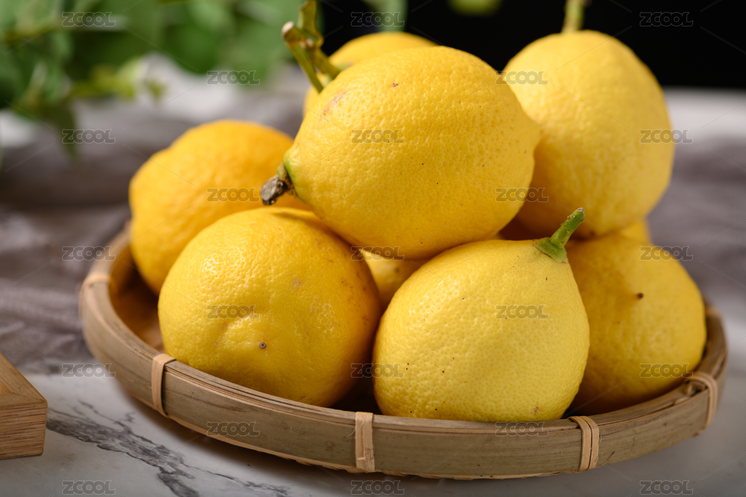 桌面上的竹簸箕上的新鲜美的的柠檬