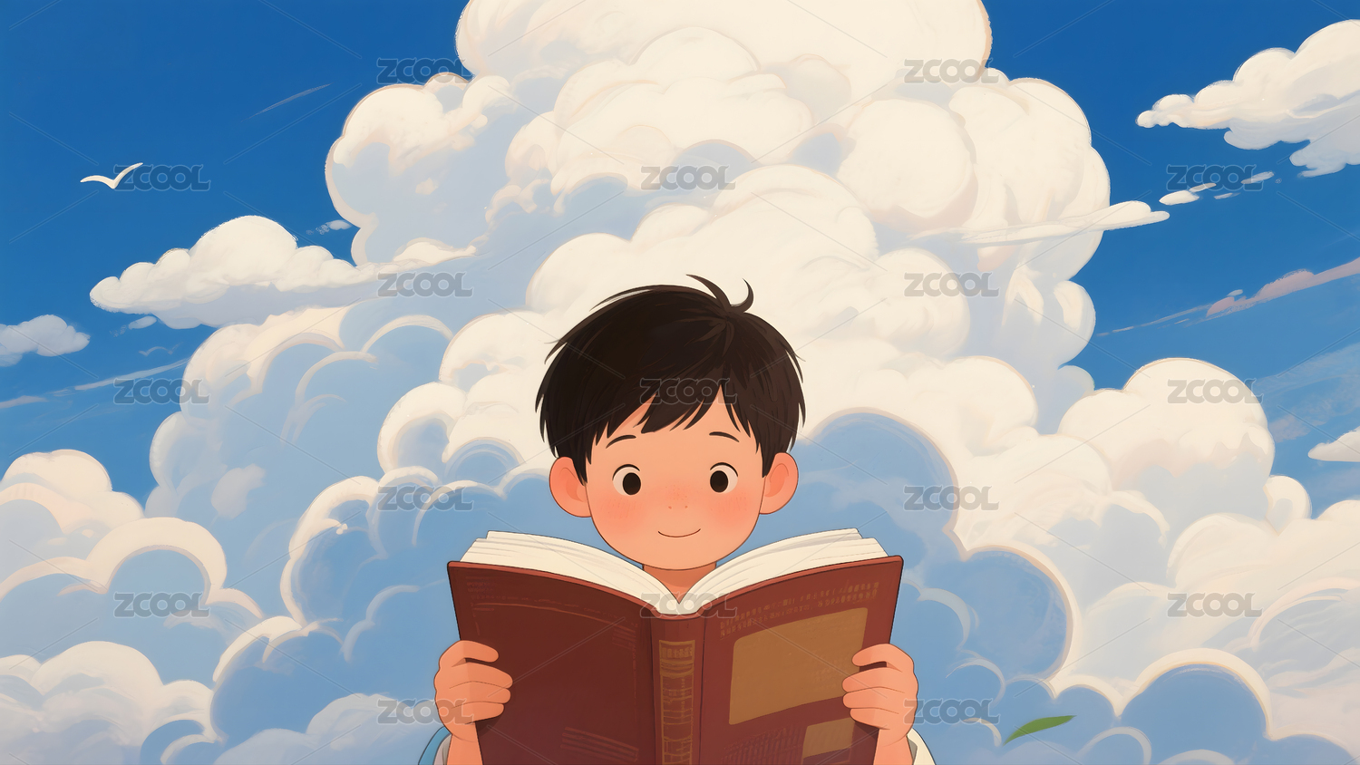 卡通男孩坐在巨大书本上阅读学习场景插画