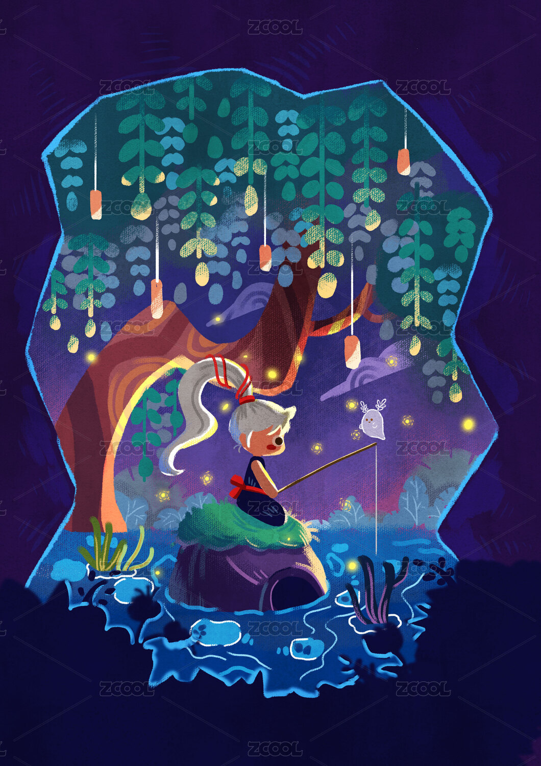 宁静的夏天夜里,女孩带着自家的宠物在玩耍