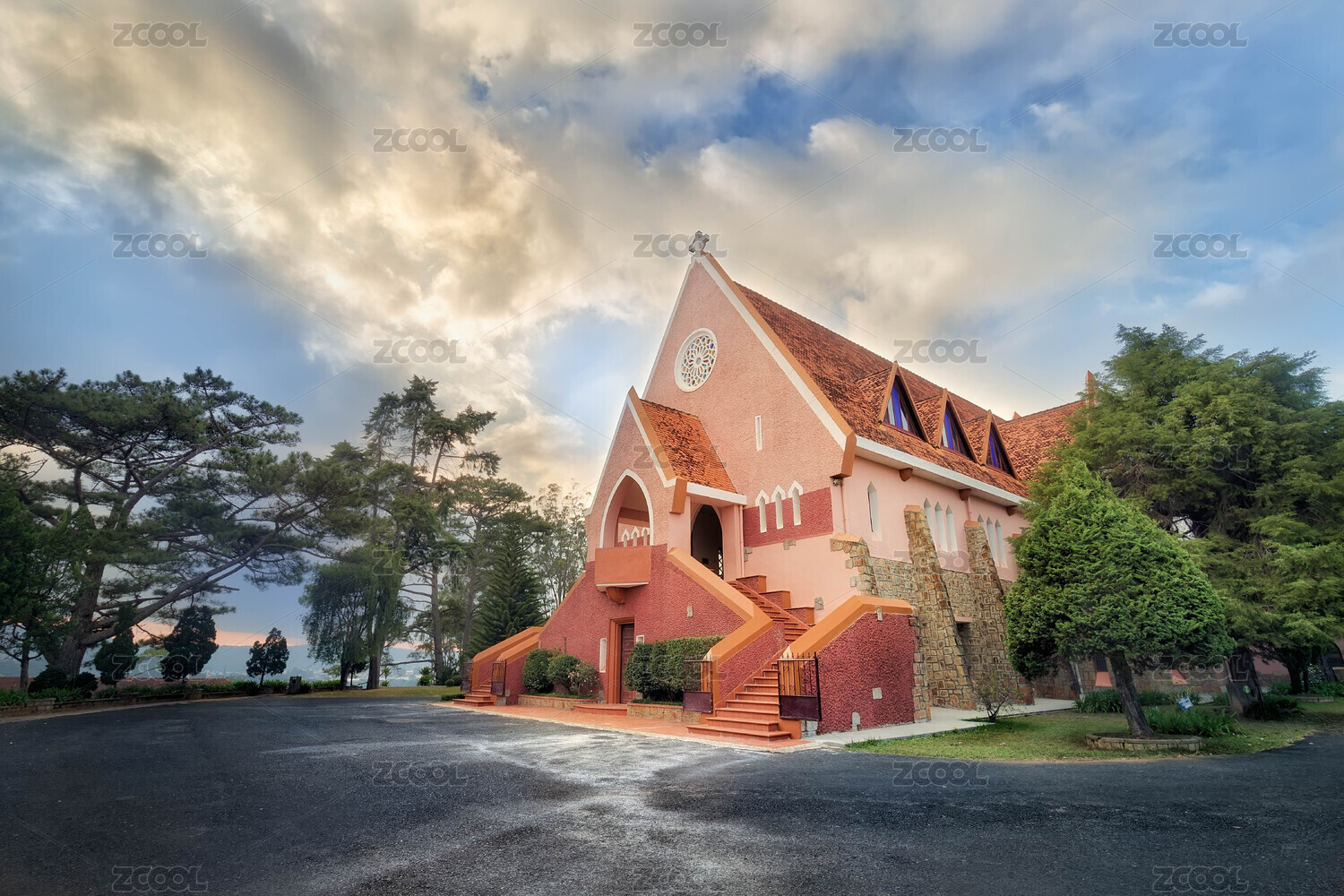 亚洲越南大叻玛丽修道院花园粉色建筑