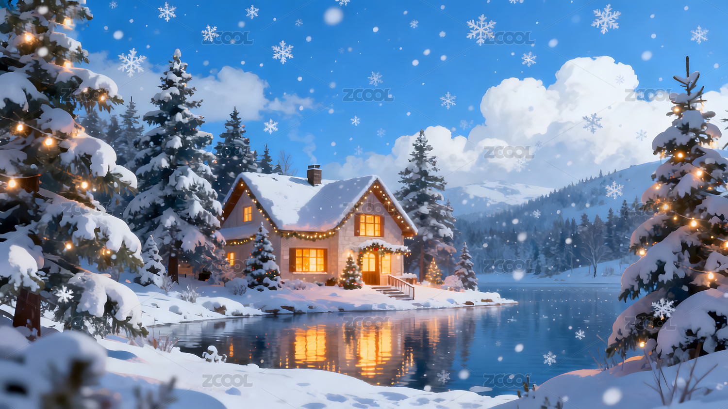 温馨冬日小屋雪景环绕光影交织