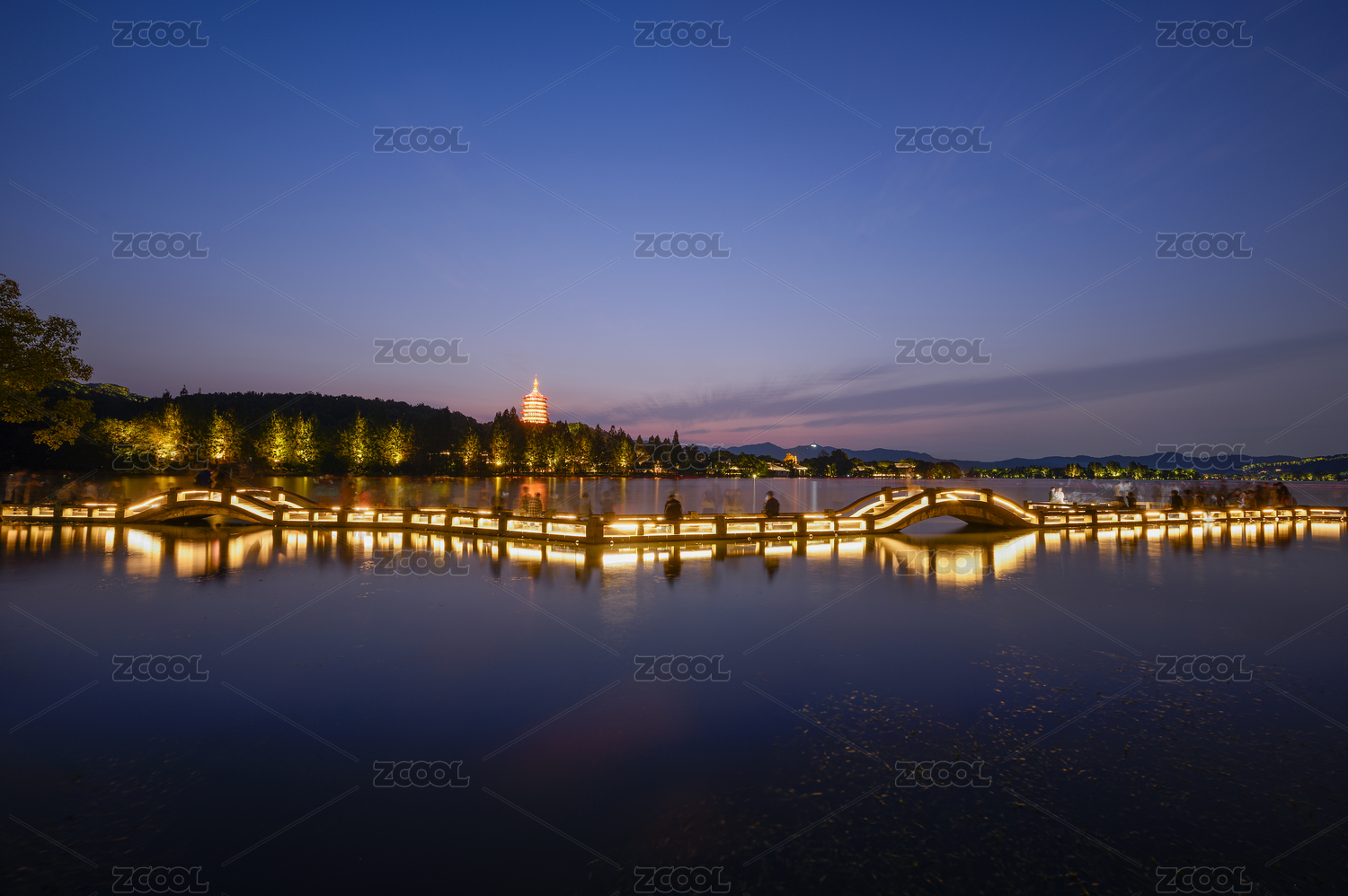杭州西湖长桥公园和雷峰塔夜景