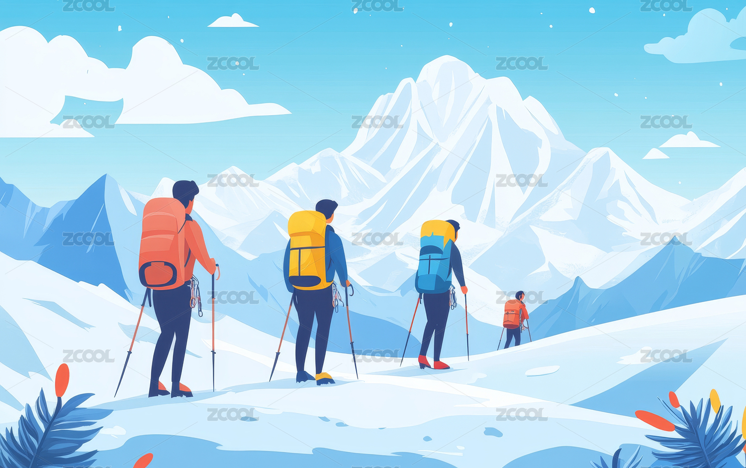 一群青年人在徒步登山的彩绘插画