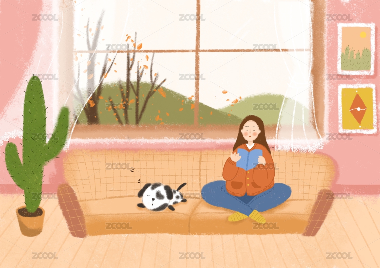 一个女生抱腿坐在地毯上望向远方思考旁边有琴叶榕和书,暖色调插画