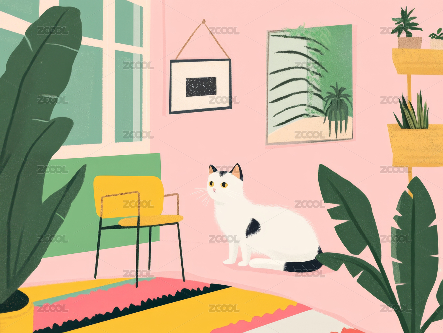 猫,绿植,植物,动物,宠物,平面,可爱,治愈,阳台,休闲